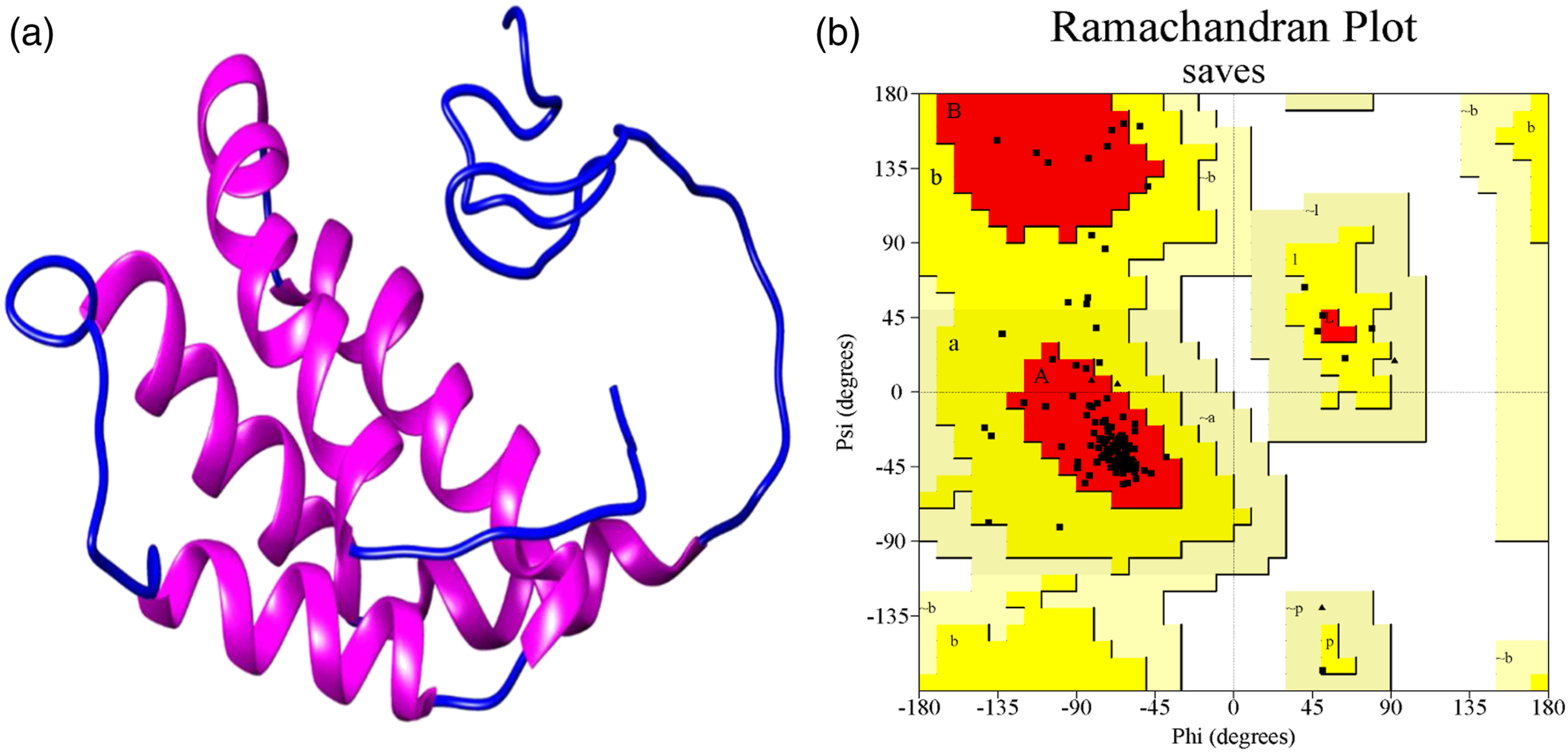 The structural evaluation is an important step to check the stability and accuracy of the predicted model. According to Verify 3D, 80.43% of the amino acid residues showed averaged 3D-1D score ≥0.2. If at least 80% of the amino acid residues of the predicted model show ≥0.2 3D-1D score then the model is considered as of good quality. The ERRAT score of the predicted model was 85.1562 that indicates good quality of the refined model. Ramachandran plot was used to analyze the polypeptides backbone regions and torsion angles (psi) ψ against (phi) φ of amino acid residues present in the protein. The AdMc1 3D model acquired 84.8% of the residues in the Ramachandran plot favoured region (A, B, L), 15.2% in additionally allowed regions (a, b, l, p), 0.0% residues in disallowed regions (∼a, ∼b, ∼ l, ∼p) and 0.0% residues belonged to generously allowed regions which signify the accuracy of the GalaxyRefine predicted model (Figure 1(b)).