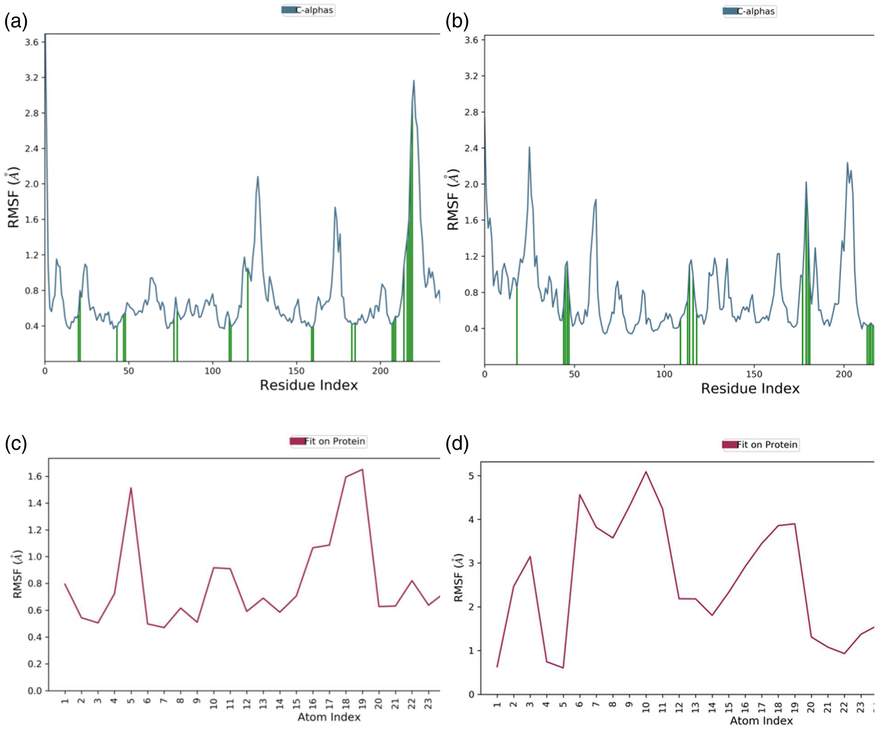 No significant flexibility as measured by Root Mean Square Fluctuation (RMSF) was observed in the secondary structure elements (SSE) (α-helices and β-strands: Helix = 31.31%, Strand = 11.88%, and Total SSE = 43.19%) of the human AR protein model (Figure S6) with major fluctuations only in residues 210-214 (Figure 10(a)). Similarly, no significant flexibility as measured by RMSF was observed in the SSEs (α-helices and β-strand: Helix = 31.35%, Strand = 16.67%, and Total SSE = 51.02%) of the human PTP protein model (Figure S7) with no major fluctuations (Figure 10(b)). The Root Mean Square Fluctuation (RMSF) plot of proteins and ligands based on Cα atoms of receptor proteins. Protein residues that interacted with the VEID are marked with green vertical bars. Protein RMSF plots of (a) human aldose reductase and (b) human protein tyrosine phosphatase; Ligand (VEID) RMSF plots for (c) human aldose reductase and (d) human protein tyrosine phosphatase.