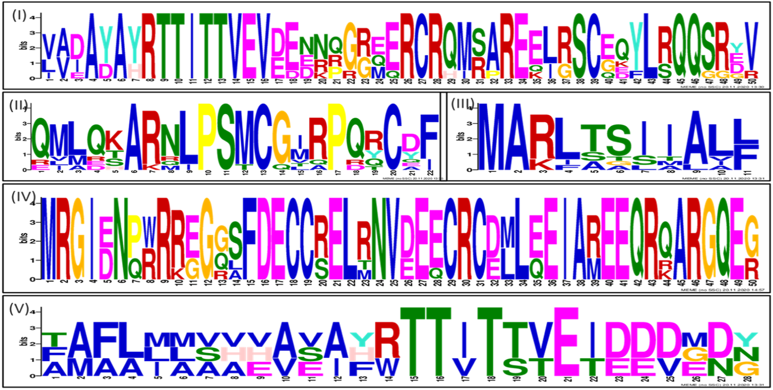 The sequence of AdMc1 protein was used to search the homologs using BLAST and top ten homologs were selected on the basis of query converge. The MEME Suite was used to explore five motifs from the selected homologs (Figure 2). The most conserved regions of the predicted motifs were used to devise 50 tetrapeptides as ligand molecules. Predicted motifs used to devise tetrapeptides from AdMc1 of