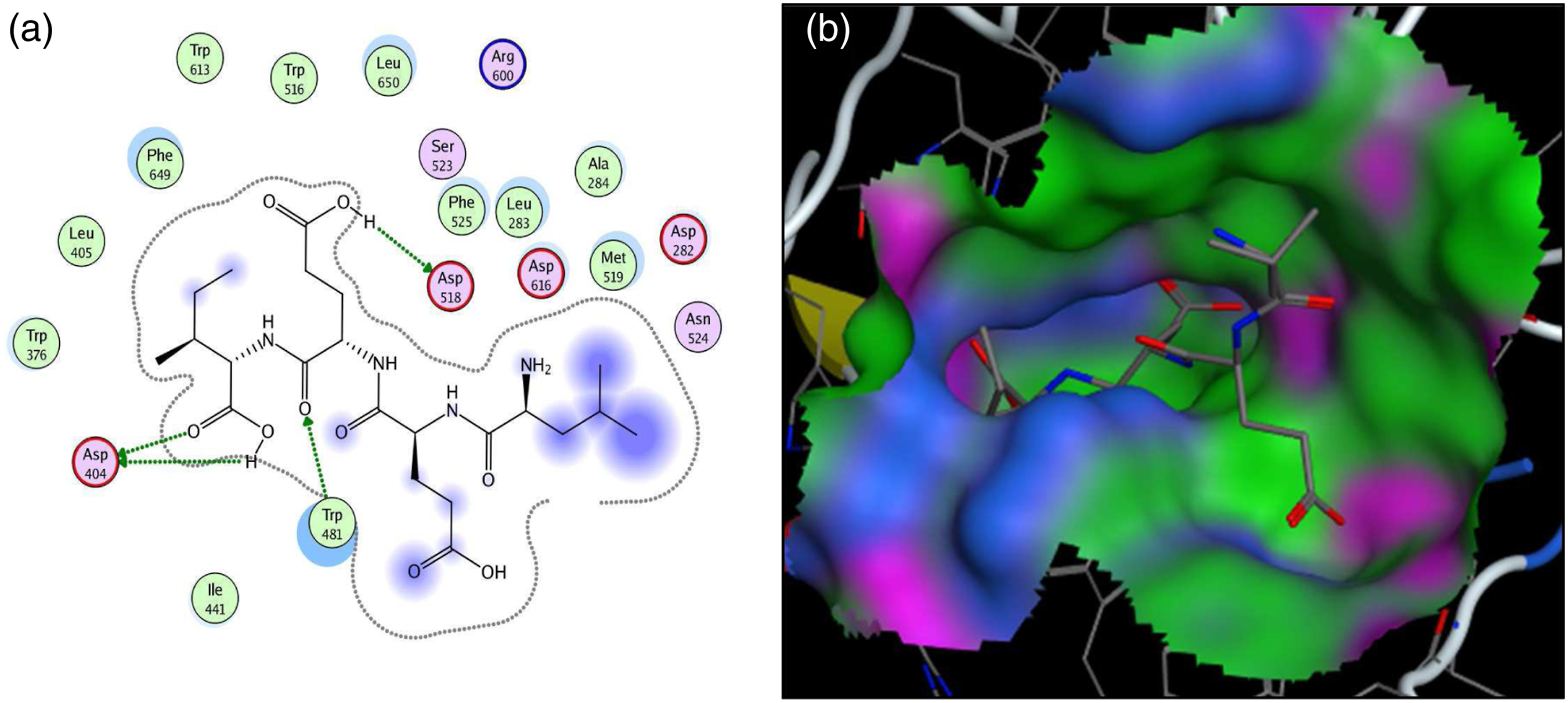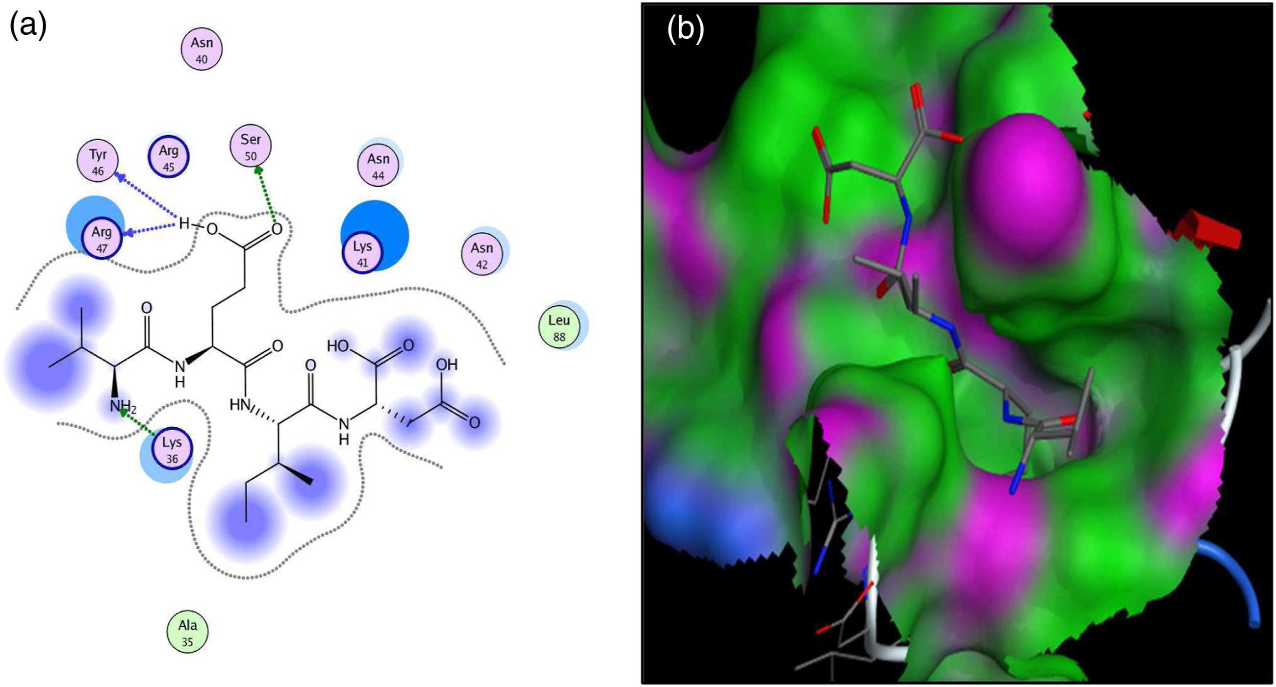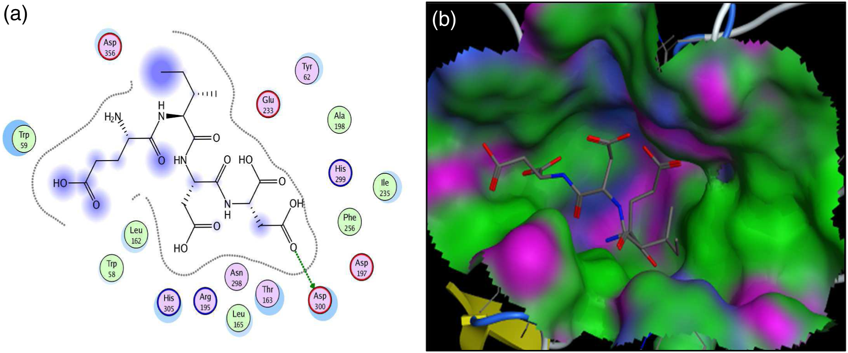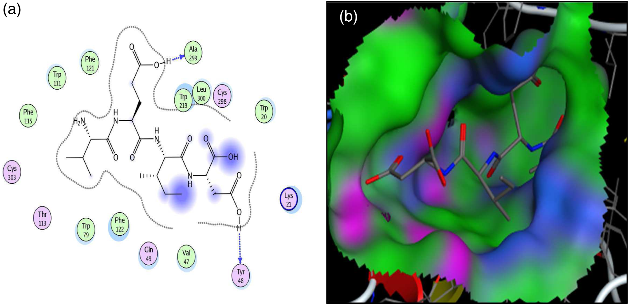 Interaction (a) and binding patterns (b) of VEID peptide with aldose reductase receptor.