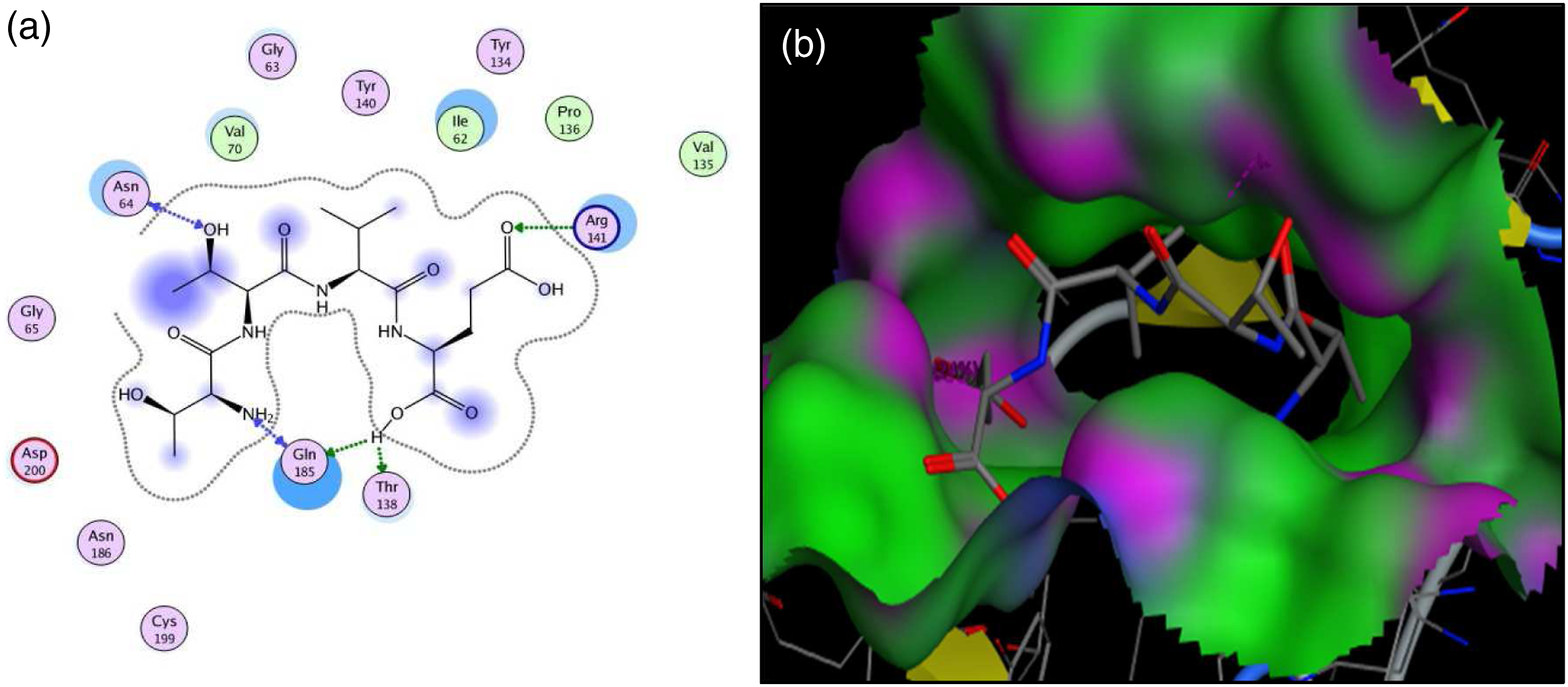 Glycogen synthase kinase 3-beta (GSK-3β) is a cellular kinase and plays a critical role in insulin signalling and glycogen metabolism. In this study, the peptide TTVE with S-score of −17.1351 showed interactions with Arg141, Asn64, Gln185 and Thr138 (Figure 8). The top five ranked ligands also showed good S-scores and binding interactions with active residues (i.e. Arg141, Gln185, Asn186, Asp200, Val135, Tyr134 and Pro136) of the receptor protein. Interaction (a) and binding patterns (b) of TTVE peptide with GSK-3β receptor.