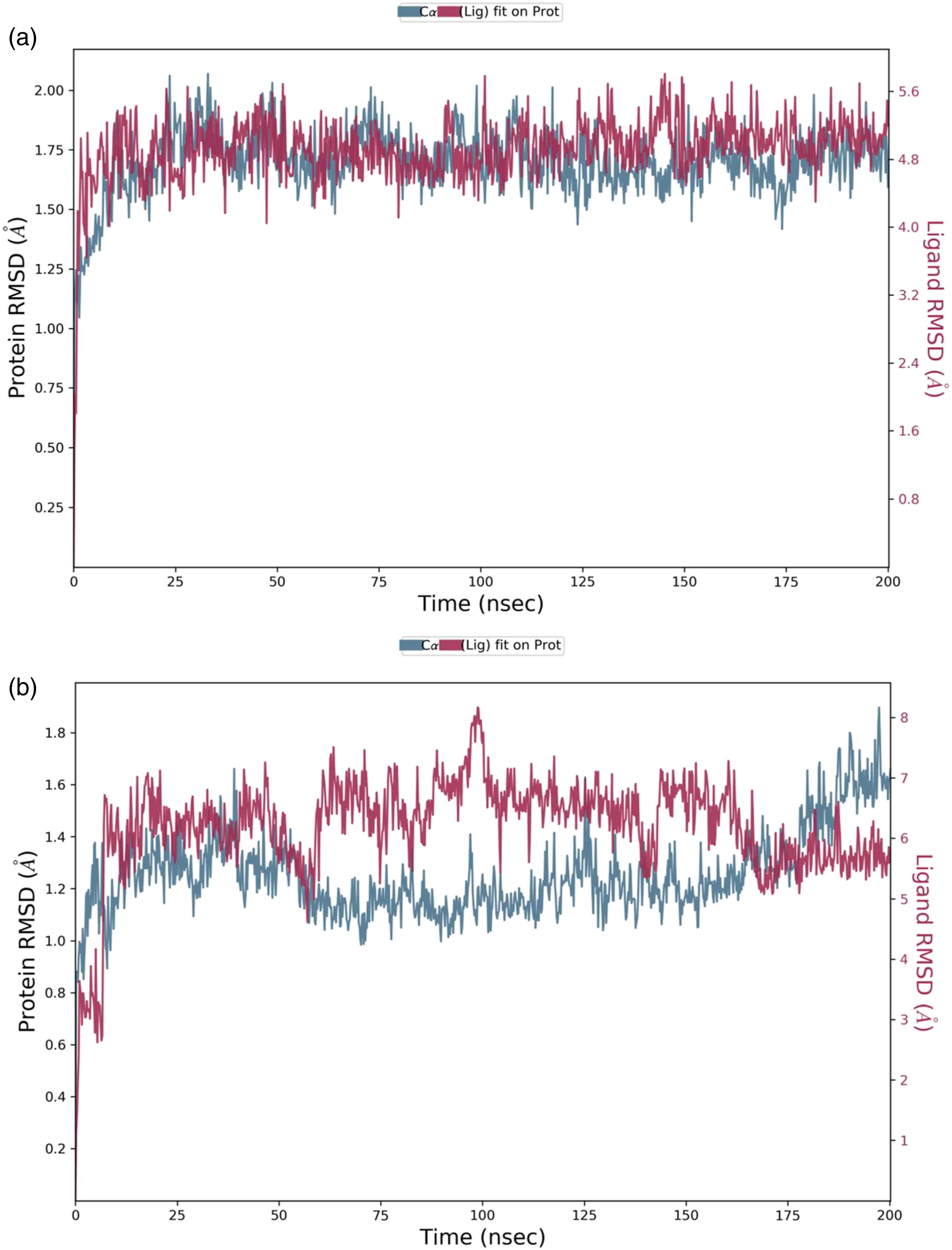 Similarly, the MD simulation RMSD trajectory of human PTP and VEID has revealed that the complex is structurally stable with RMSD value of 1.1 Å to 1.6 Å (change in RMSD is below 3 Å) throughout 200 ns time period (Figure 9(b)). The combined RMSD of the protein-ligand complex during MD simulation also remained stable throughout the simulation time frame of 200 ns as combined trajectories did not show any notable fluctuations in trajectory or RMSD change. From this stability, it is elucidated that with respect to time this docking complex is structurally stable after making hydrogen bonds and other interactions.