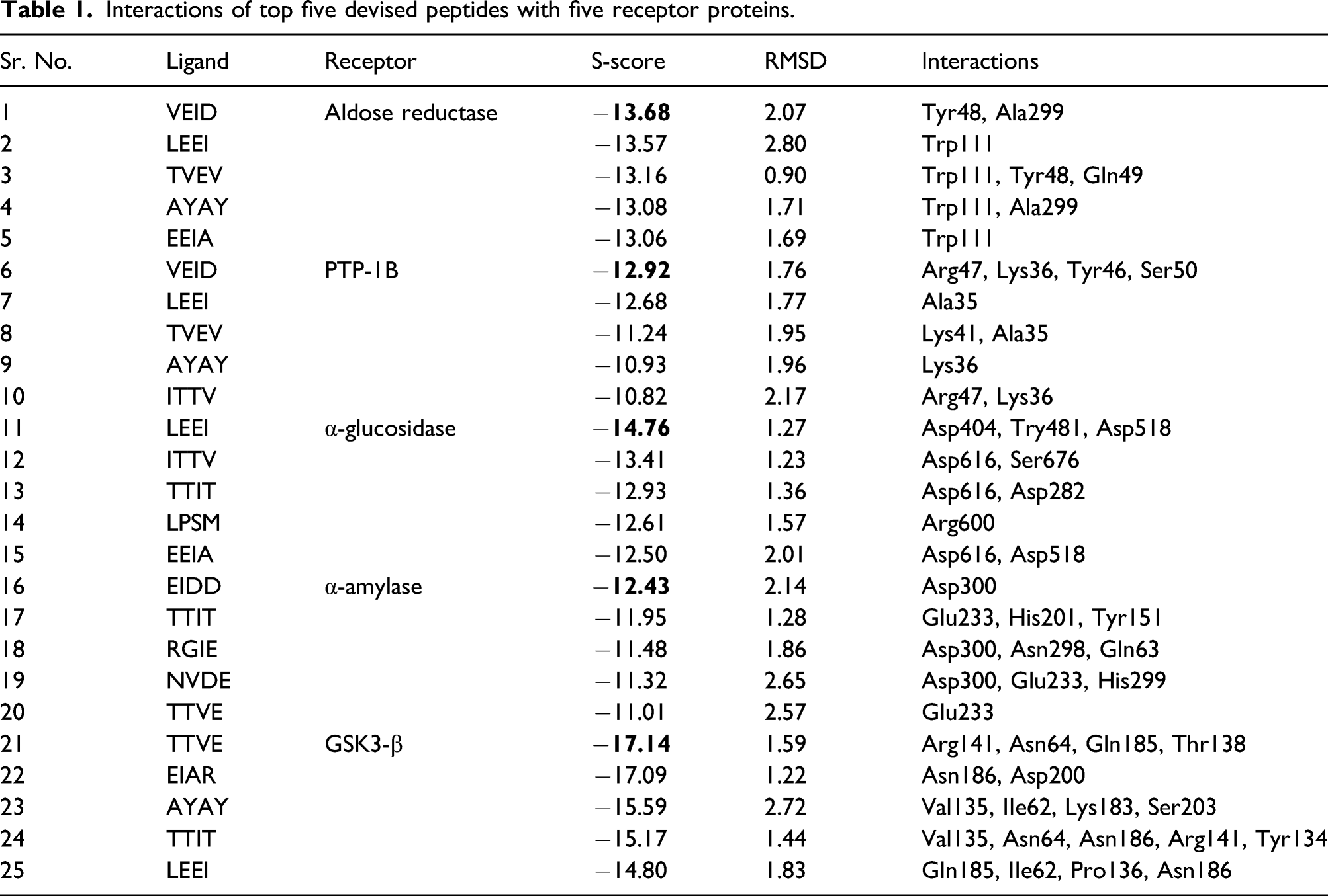 Interactions of top five devised peptides with five receptor proteins.