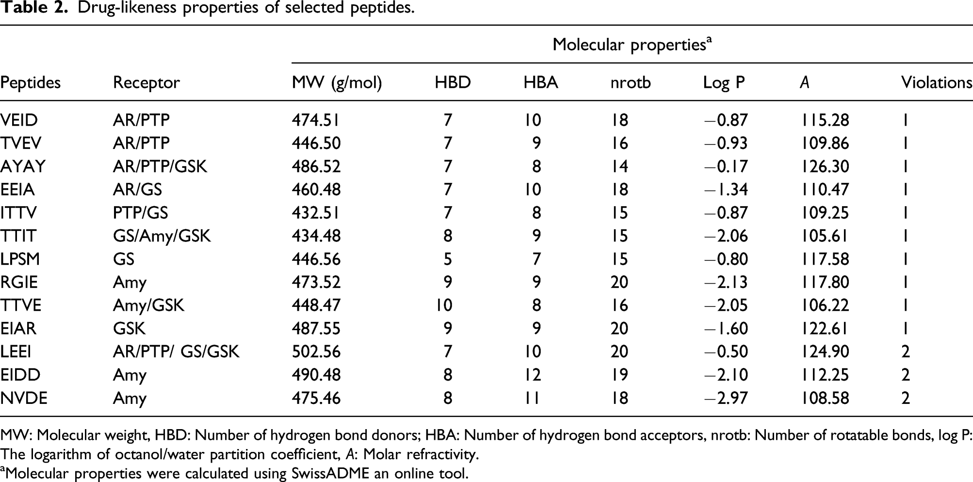 Drug-likeness properties of selected peptides.
