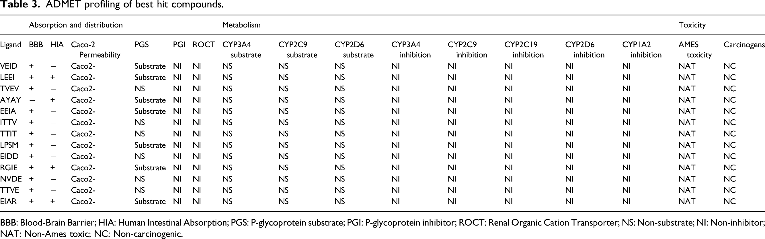 BBB: Blood-Brain Barrier; HIA: Human Intestinal Absorption; PGS: P-glycoprotein substrate; PGI: P-glycoprotein inhibitor; ROCT: Renal Organic Cation Transporter; NS: Non-substrate; NI: Non-inhibitor; NAT: Non-Ames toxic; NC: Non-carcinogenic.