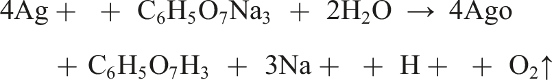 Typically, 125 mL of 0.002 M AgNO3 was heated to boil; then, 10 mL of 1% trisodium citrate were added drop by drop. Subsequently, the solution was subjected to ultrasonication using Hielscher UP400S (400 W) at an amplitude of 73% and a cycle of 0.81 for 15 min at 90°C until the color changed to pale yellow. Then, the solution was cooled to room temperature avoids light incidence. The following equations illustrate the formation of silver nanoparticles: