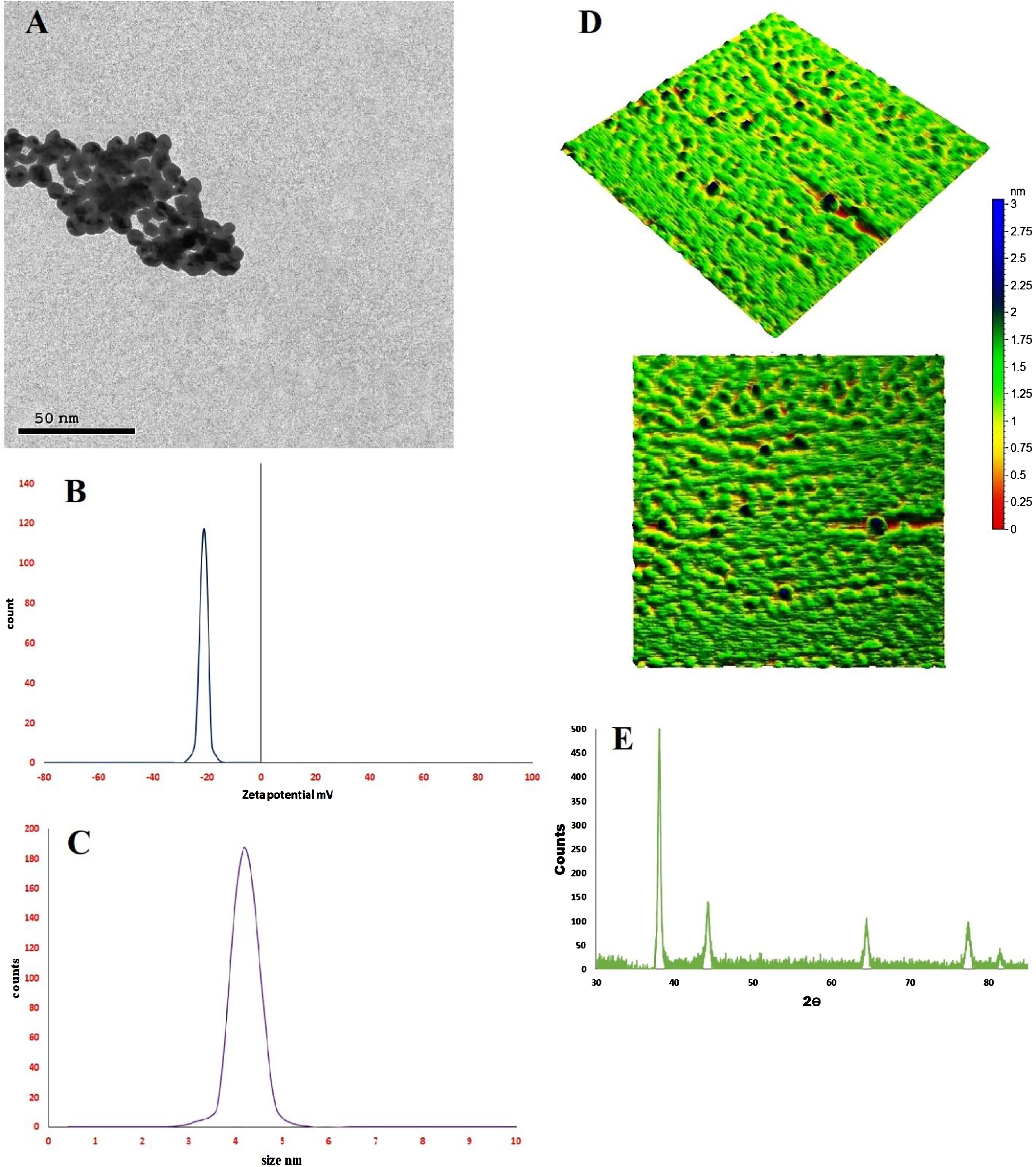 The XRD pattern of the silver-neomycin nano gel illustrates the XRD fingerprint pattern for nano silver, according to JCPDS file No. 04-0783, while the gel matrix and neomycin do not show any peaks due to its amorphous nature. Atomic force microscope and TEM images illustrate the spherical shape of silver and neomycin nanoparticles without aggregation, homogenously dispersed in the gel matrix. Dynamic light scattering showed a 4 nm size for nano silver particles, which agrees with AFM image data analysis but not with TEM images, due to the good coating of the gel matrix to silver nanoparticles. The zeta potential was −21 mV, illustrating the high bioactivity of the silver-neomycin nano gel (Figure 1). (A) Transmission electron microscopy (TEM), (B) Zeta potential, (C) Dynamic light scattering (DLS), (D) Atomic force microscopy (AFM), and (E) X-ray diffraction (XRD) of neomycin silver nano-composite gel.