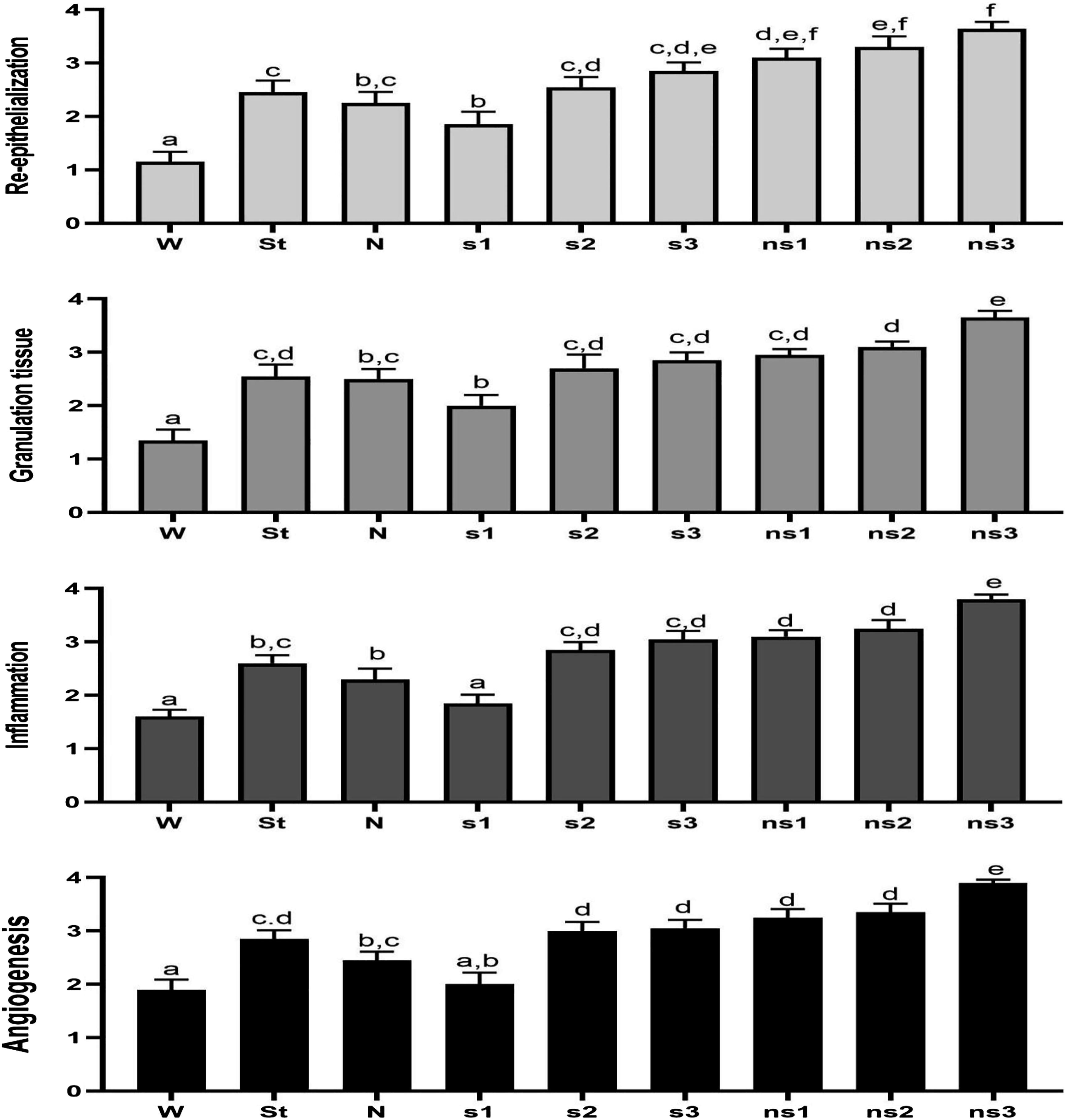 The statistical analysis of wound healing parameters showed a significant decrease in re-epithelization, granulation tissue, inflammation, and angiogenesis in the W group compared to other groups. Meanwhile, a significant increase in granulation tissue, inflammation, and angiogenesis was recorded in NS3 group in comparison with all other experimental groups (Figure 4). Re-epithelization, granulation tissue, inflammation and angiogenesis of wound healing evaluation on day 15 in different groups (W: wound untreated group, St: wound group treated with fusidic acid cream, N: wound group treated with neomycin gel, S1: wound group treated with silver nano gel 1, S2: wound group treated with silver nano gel 2, S3: wound group treated with silver nano gel 3, NS: wound group treated with neomycin silver nano-composite gel 1: 1, NS2: wound group treated with neomycin silver nano-composite gel 1: 2 and NS3: wound group treated with neomycin silver nano-composite gel 1: 3). (Data Expressed as means ± standard error. Different letter indicates a significant difference at