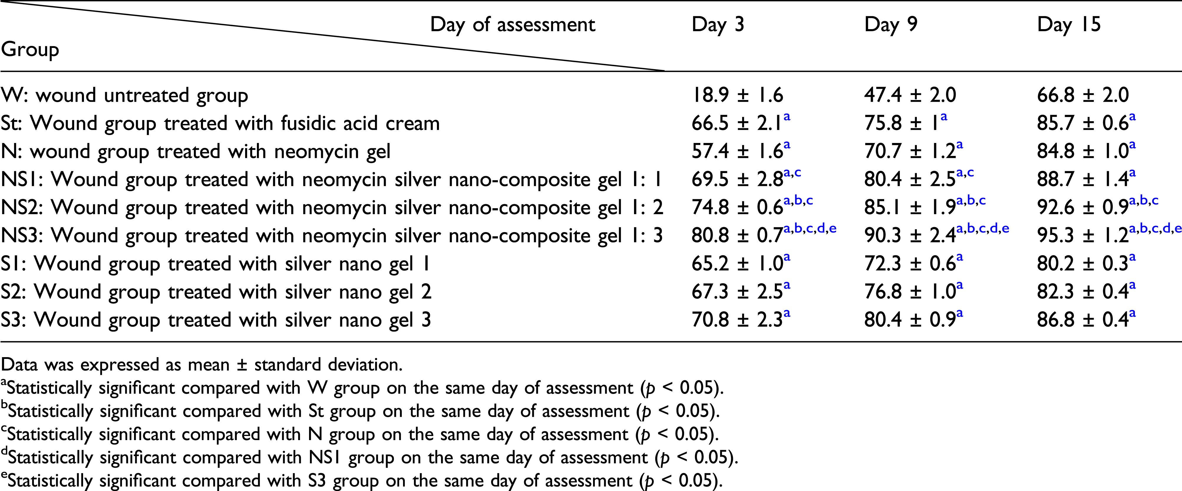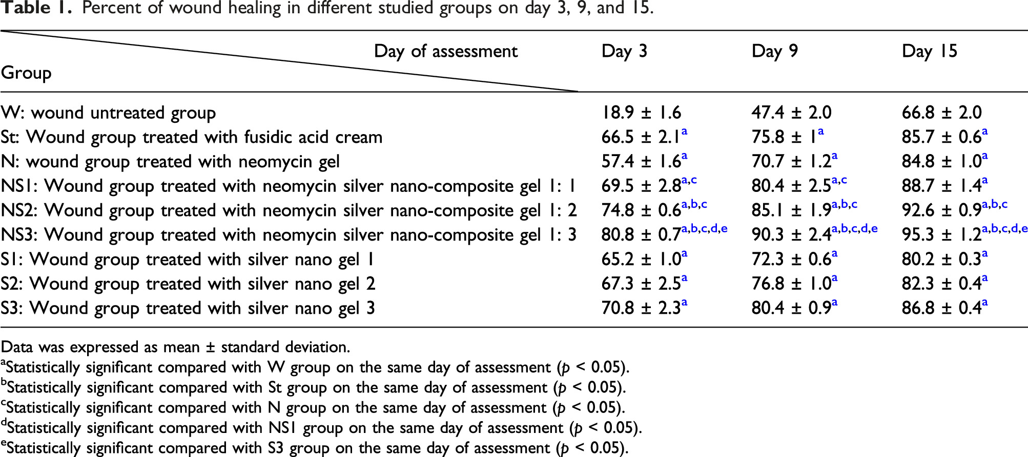 The present results showed that daily topical application of neomycin or a silver nano-composite together with fucidin cream promoted wound healing compared to the non-treatment group. Wound healing occurs in the healthy skin surrounding the wounds which coats or covers the naked area. These processes may be due to myofibroblasts, while epithelialization or epithelial regeneration following damage, require the proliferation and immigration of epithelial cells to the wound center. 35 In addition, there is significant concentration dependent promotion of wound healing in the groups topically treated with a silver nano-composite (S1, S2, and S3) compared with untreated group and that treated with fucidin cream only. Silver nanoparticles could effectively inhibit and kill the bacteria in a concentration and time dependent manner.