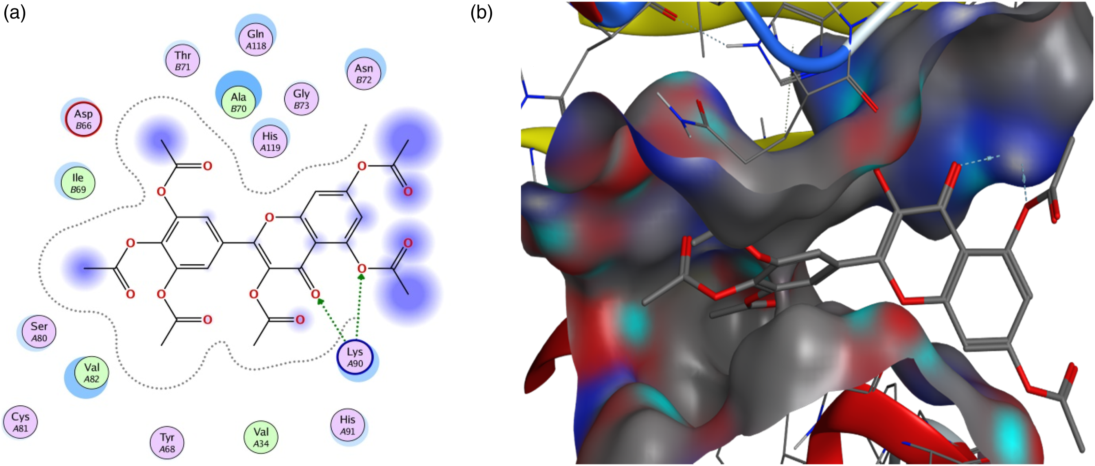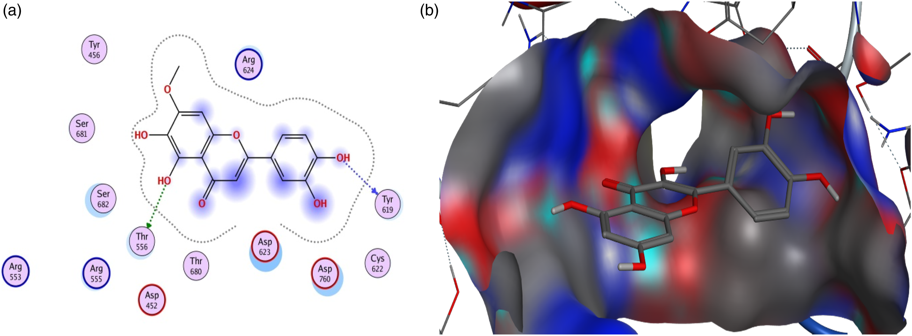 The results presented in Table 1 clearly show that all the compounds bind to selected viral proteins to varying degrees. Different ligands have the highest binding affinities for different proteins and the best protein-ligand interaction for each protein is shown in Figures 1–6. Pedalitin has binding energy of −13.832 kcal/mol against SARS-CoV-2 RdRp and form hydrogen bonds with Thr556 and Tyr619 amino acid residues of the receptor protein (Figure 1). In case of ADP ribose phosphatase of NSP3 from SARS-CoV-2, the compound myricetin hexaacetate exhibited the lowest binding energy of −12.990 kcal/mol and molecular interactions for hydrogen bonding involved LysA90 of the receptor protein (Figure 2). Binding interactions of pedalitin with SARS-CoV-2 RNA-dependent RNA polymerase revealed through protein-ligand approach. (a) Interactions of pedalitin with the receptor; (b) Binding patterns of pedalitin with the receptor protein. Binding interactions of myricetin hexaacetate with ADP ribose phosphatase of NSP3 from SARS-CoV-2 revealed through protein-ligand approach. (a) Interactions of myricetin hexaacetate with the receptor; (b) Binding patterns of myricetin hexaacetate with the receptor protein. Binding interactions of limonoic acid with NSP9 RNA binding protein of SARS-CoV-2 revealed through protein-ligand approach. (a) Interactions of limonoic acid with the receptor; (b) Binding patterns of limonoic acid with the receptor protein. Binding interactions of betaxanthin with NSP7 and NSP8 complex of SARS-CoV-2 revealed through protein-ligand approach. (a) Interactions of betaxanthin with the receptor; (b) Binding patterns of betaxanthin with the receptor protein. Binding interactions of quercitrin with SARS-CoV-2 main protease (Mpro) revealed through protein-ligand approach. (a) Interactions of quercitrin with the receptor; (b) Binding patterns of quercitrin with the receptor protein. Binding interactions of fomecin A with SARS-CoV-2 main protease C145S mutant with SARS-CoV-2 main protease (Mpro) revealed through protein-ligand approach. (a) Interactions of fomecin A with the receptor; (b) Binding patterns of fomecin A with the receptor protein.