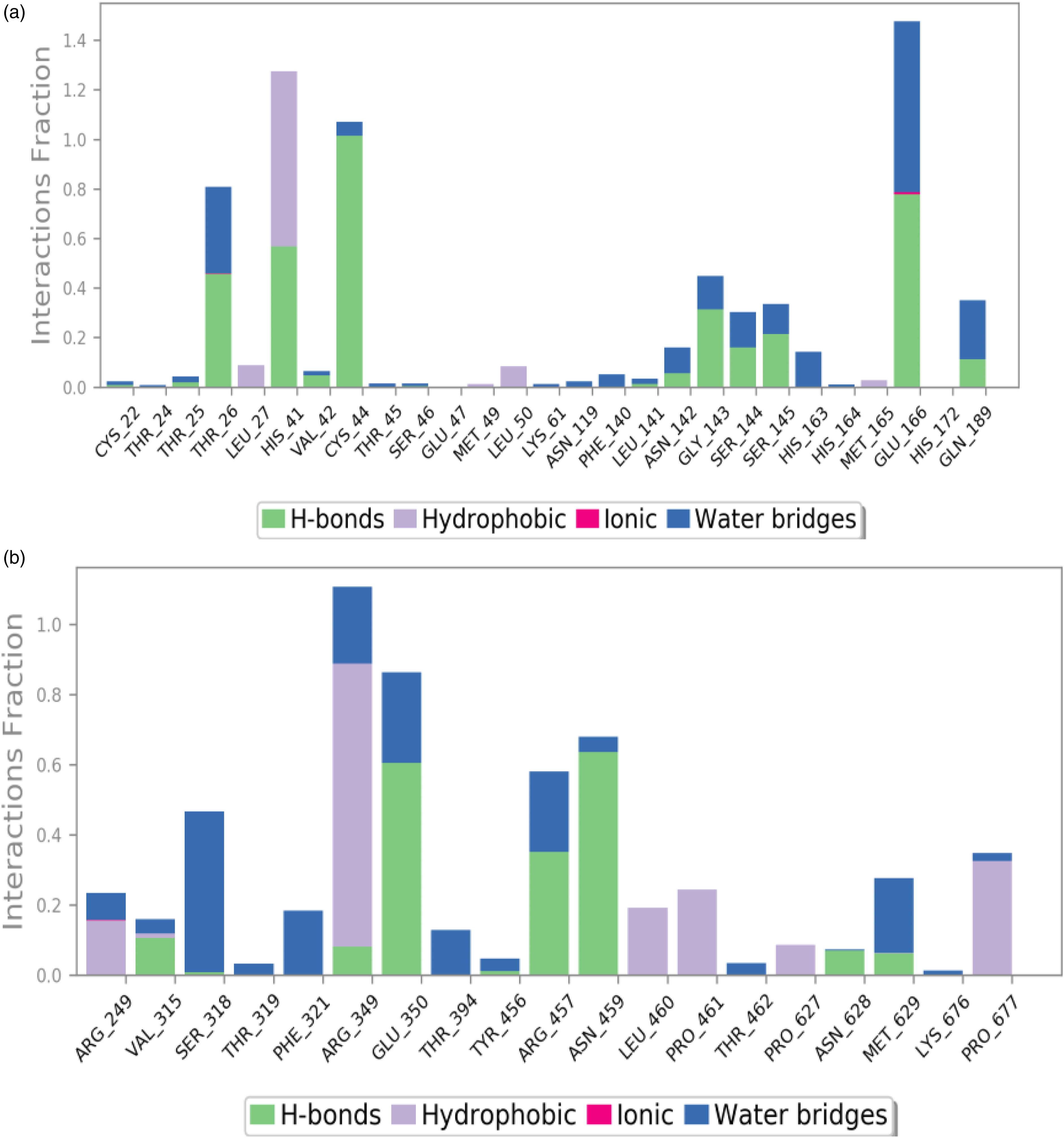As seen in Figure 10, the majority of the significant ligand–protein interactions determined with MD are hydrogen bonds and hydrophobic interactions. In terms of hydrophobic interactions, His41 is the most important, whereas Thr26, His41, Cys44, and Glu166 are important in terms of H-bonds for the MPCM-ligand complex (Figure 10(a)). In terms of hydrophobic contacts, Arg349 is the most important, while Glu350, Arg457, and Asn459 are vital for H-bonds in RDRP-ligand complex (Figure 10(b)). The stacked bar charts were standardized over the course of the trajectory: for example, a value of 1.0 indicates that the specific interaction was maintained for 100% of the simulation time. Because some protein residues may make several interactions of the same subtype with the ligand, values above 1.0 are feasible. Protein-ligand contact histogram. Protein structures complexed with A: MPCM-ligand complex (SARS-CoV-2 main protease C145S mutant with pedalitin), B: RDRP-ligand complex (SARS-CoV-2 RdRp with pedalitin).