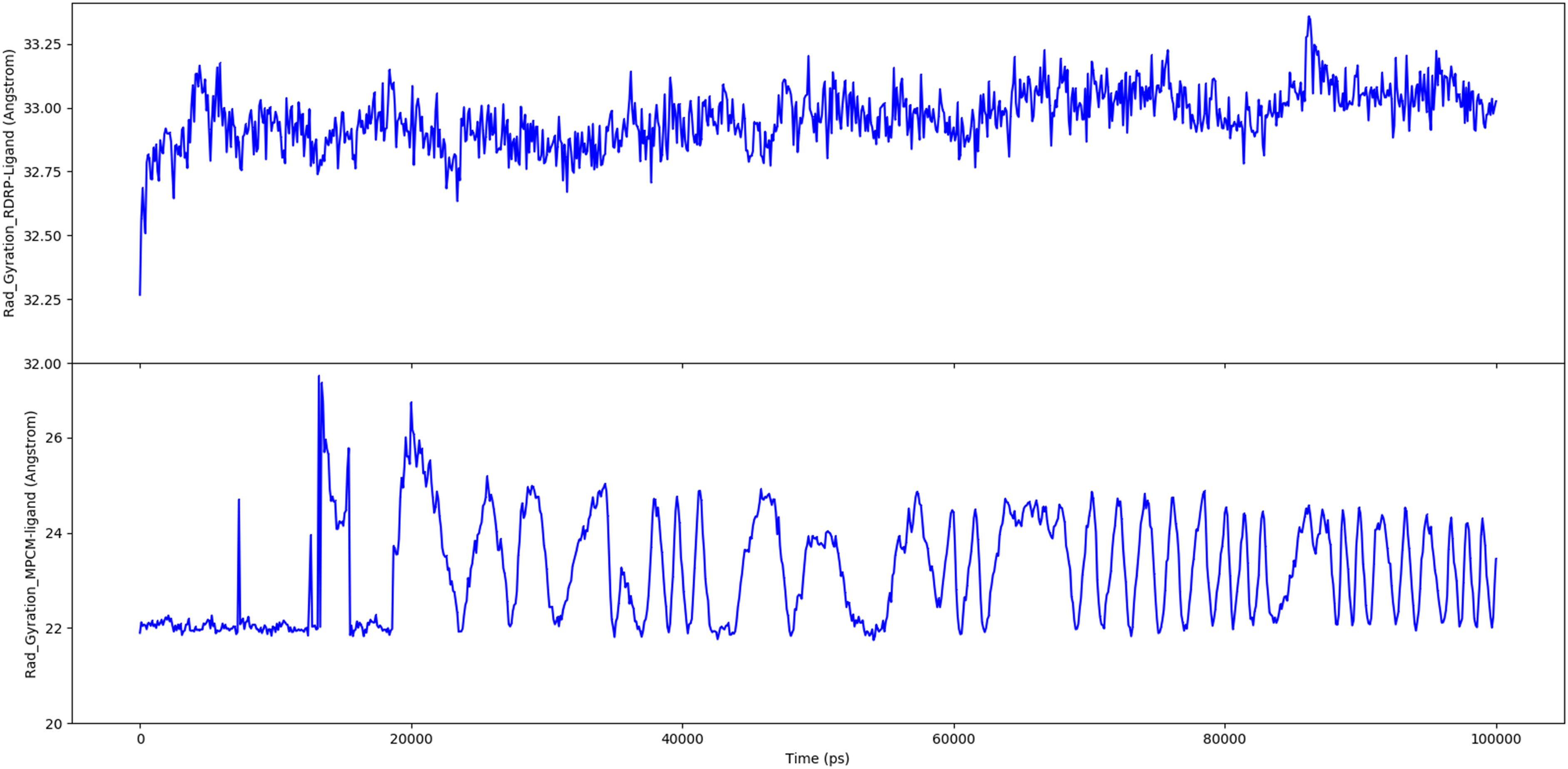 The distribution of atoms in a protein around its axis is known as the radius of gyration (Rg). Rg is the length that reflects the distance between the rotating point and the place where the energy transfer has the greatest effect. This conceptual idea also aids in the identification of diverse polymer kinds, such as proteins. The two most important markers for forecasting the structural activity of a macromolecule are the calculation of Rg and distance calculations because when a ligand/lead molecule binds to a protein, the radius of gyration changes due to a conformational shift. The folding pace of a protein is directly related to its compactness that is tracked by an advanced computer approach for determining the radius of gyration. The radius of gyration calculated for two targets bound with ligand is shown in Figure 11. Radius of Gyration calculated for two targets bound with ligand. A: MPCM-ligand complex (SARS-CoV-2 main protease C145S mutant with pedalitin), B: RDRP-ligand complex (SARS-CoV-2 RdRp with pedalitin).