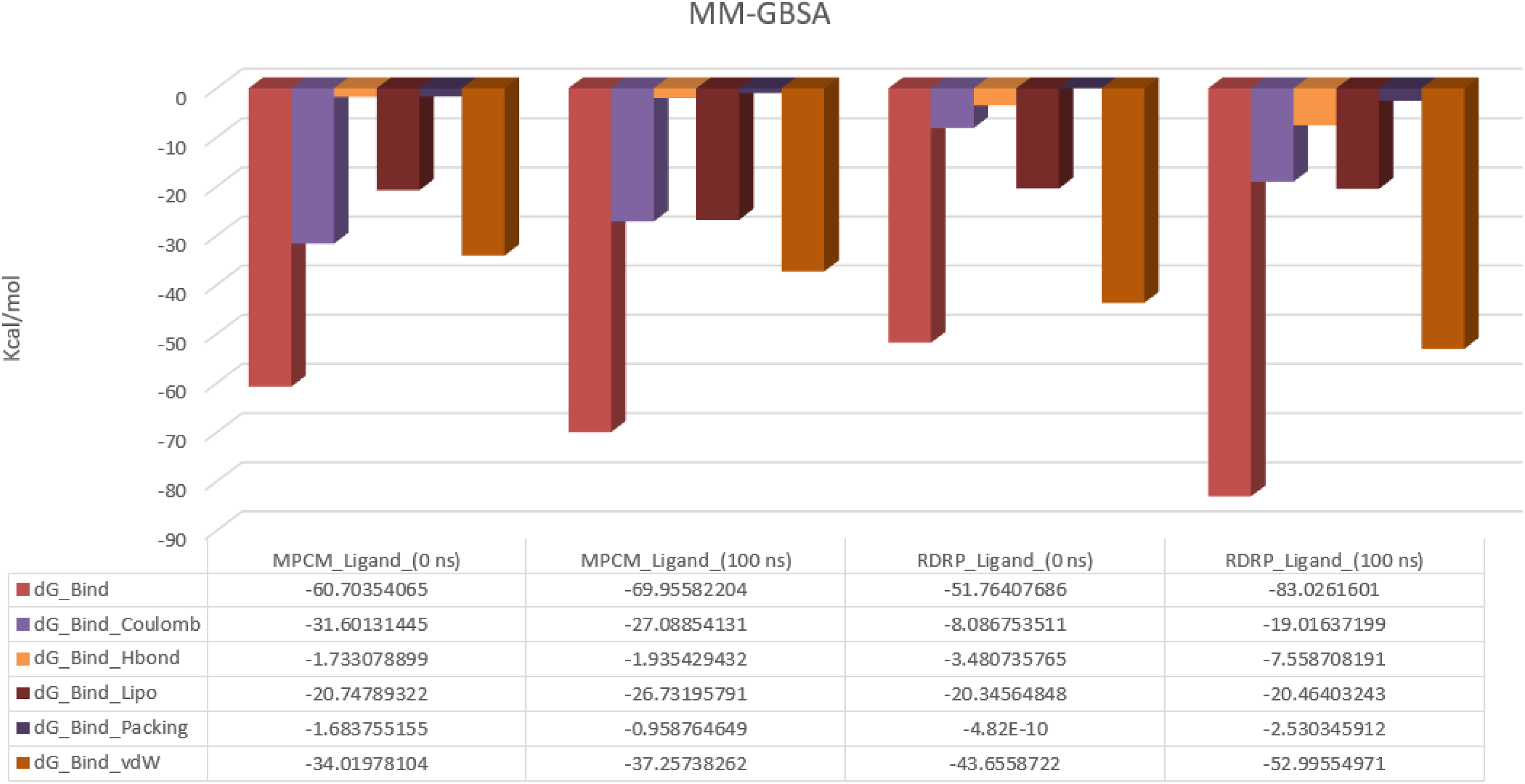 For MD Simulation, the Molecular Mechanics Generalized Born Surface Area (MM-GBSA) was determined (Figure 12). For the MPCM-ligand complex, the average dG was −65.33, the dG standard deviation was 4.63, and the dG range was −69.69 to −60.70. The average dG for RDRP-ligand complex was −67.39, with a dG standard deviation of 15.63 and a dG range of −83.03 to −51.75. It was exhibited that most of the residues of both receptors near the binding site of the ligand contributed significantly in stabilizing the ligand as can be seen by lower binding energy values. MM-GBSA calculated before and after the simulation.