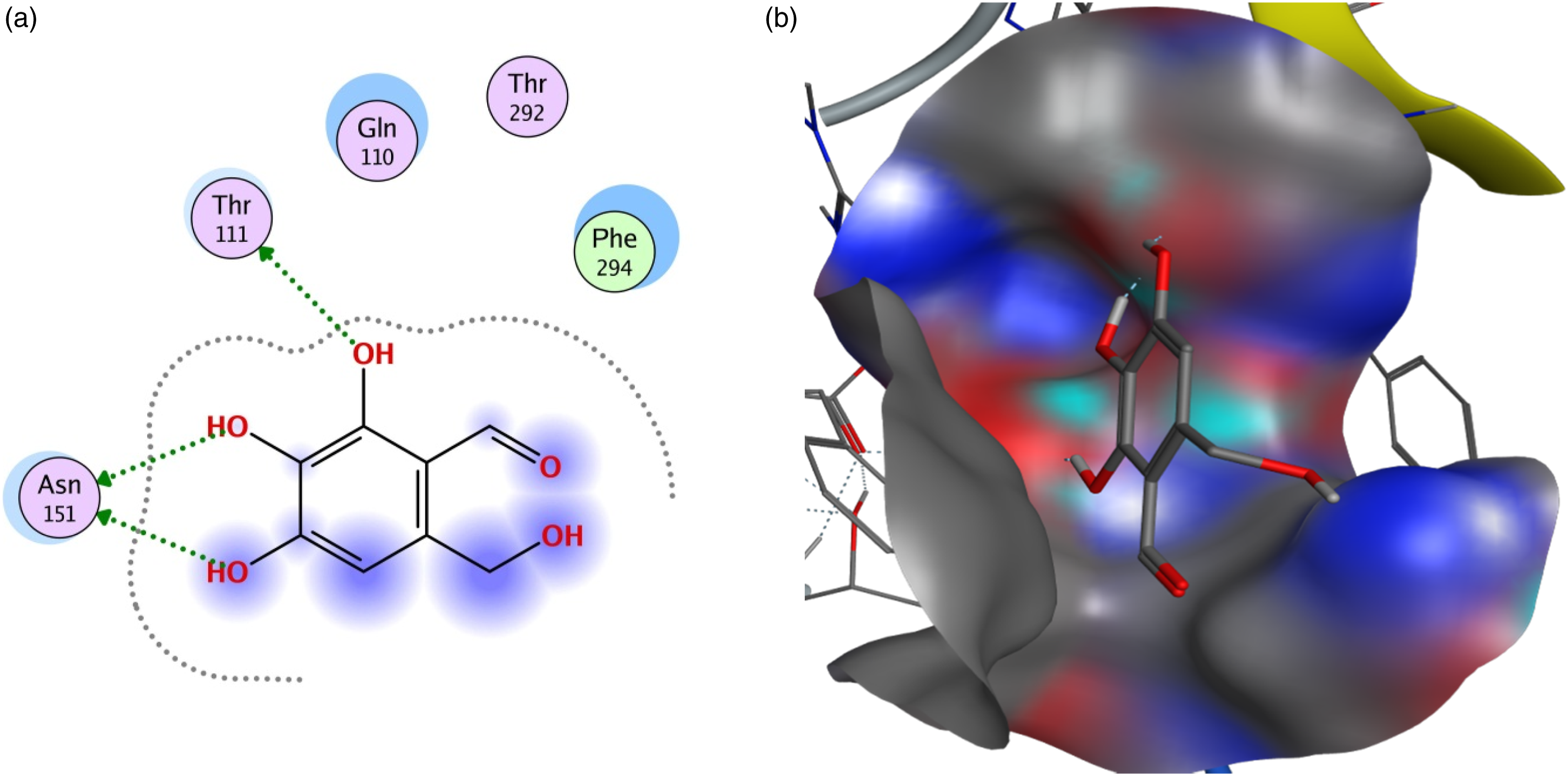 The Nsp9 RNA binding protein of SARS-CoV-2 showed lowest binding energy with limonoic acid (−12.271 kcal/mol), and CysA74, SerB6, and ValB8 residues of the receptor protein was involved in the molecular interactions and binding patterns (Figure 3). Betaxanthin revealed −12.946 kcal/mol energy against NSP7 and NSP8 complex of SARS-CoV-2 and showed binding interactions with LysA127, and LysC127 residues of the receptor protein (Figure 4). For SARS-CoV-2 Mpro, quercitrin showed −13.35 kcal/mol binding energy and exhibited interactions with Thr26, His163, and Glu166 residues of the receptor protein (Figure 5). Fomecin A with binding energy of −12.325 kcal/mol showed strong interactions with SARS-CoV-2 main protease from C145S mutant and the interactions involved Thr111 and Asn151 residues in the docking site of the receptor protein for hydrogen bond formations (Figure 6).