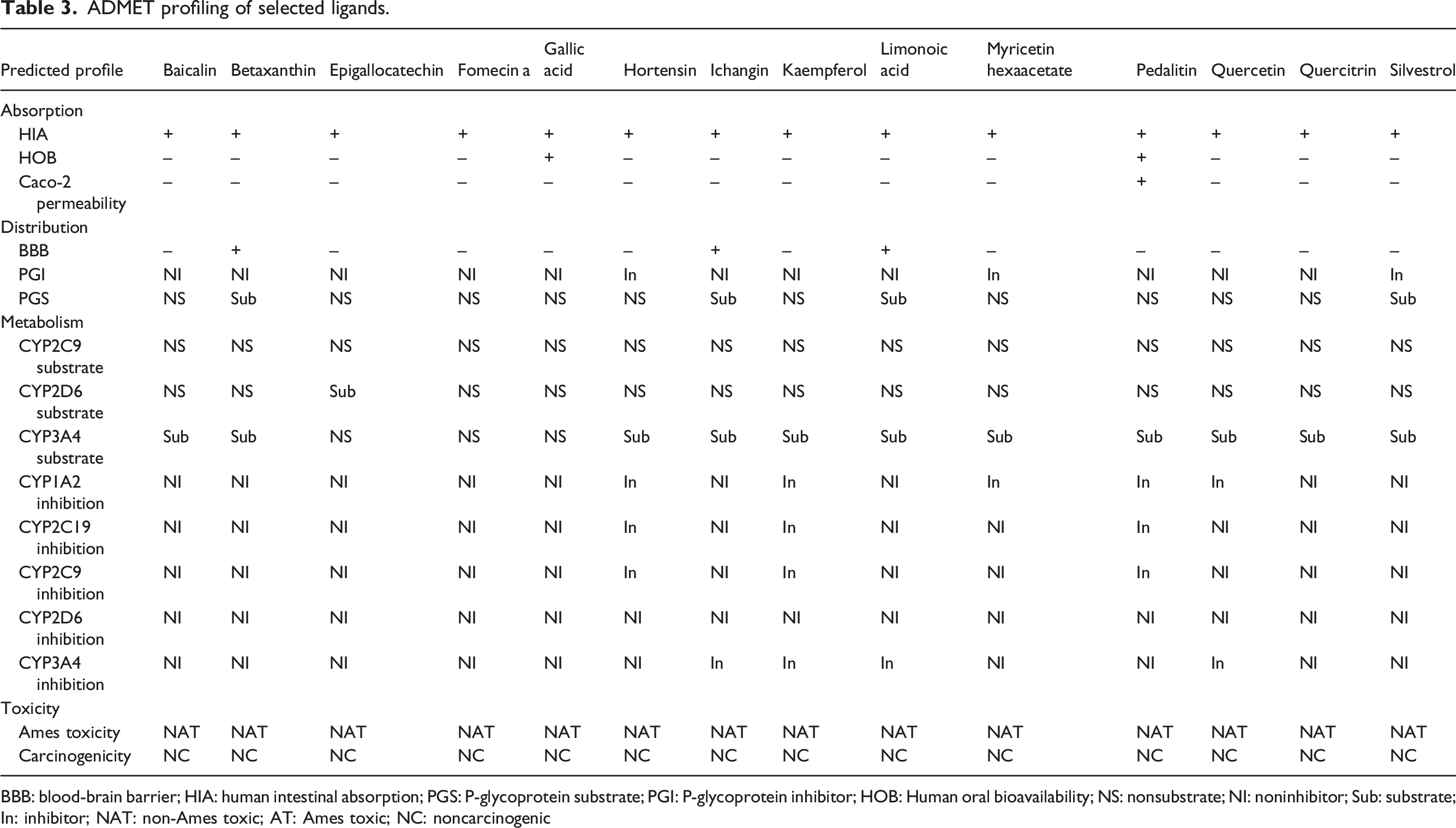The online tool admetSAR 2.0 25 (http://lmmd.ecust.edu.cn/admetsar2/) was used for ADMET profiling of potential drug candidates. ADMET classify drugs in five aspects (absorption, distribution, metabolism, excretion, and toxicity) to recognize the drug bioavailability from chemical biochemistry perspective. Only those compounds which accomplish all the pharmokinetics parameters could further be reported as potential drug candidates against selected viral receptor proteins.