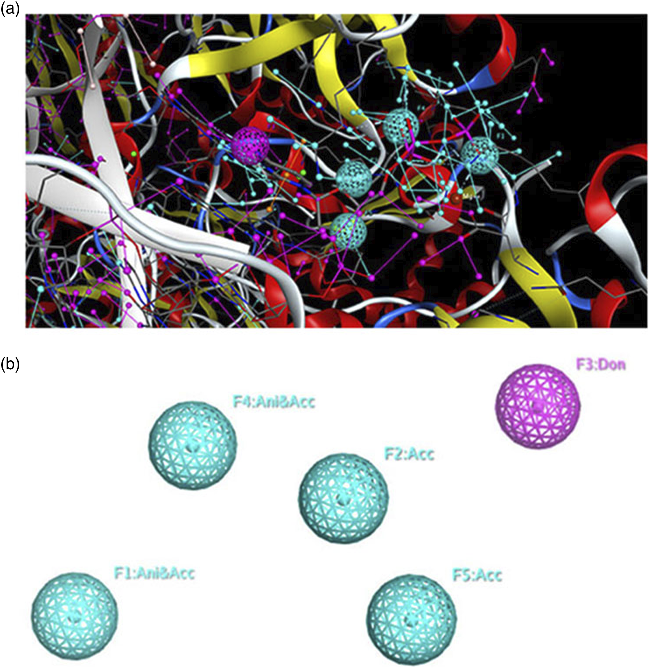 A pharmacophore model was created for five antiretroviral (ARV) drugs in complex with reverse transcriptase that fall under the category of non-nucleotide reverse transcriptase inhibitors (NNRTIs). The shared features of these compounds are depicted in Figure 2. The figure presents a simplified representation, both with the alignment of the five ligands (Figure 2(a)) and without the ligands (Figure 2(b)). The 3D pharmacophore model encompasses five common features: F1 = Don, F2 = Acc, F3 = Aro, F4 = Aro, and F5 = Aro, which are a combination of the features mentioned earlier. 3D pharmacophoric map of NNRTI class ligands. (a), a simplified view of the model with aligned ligands. (b), a simplified view without aligned ligands.