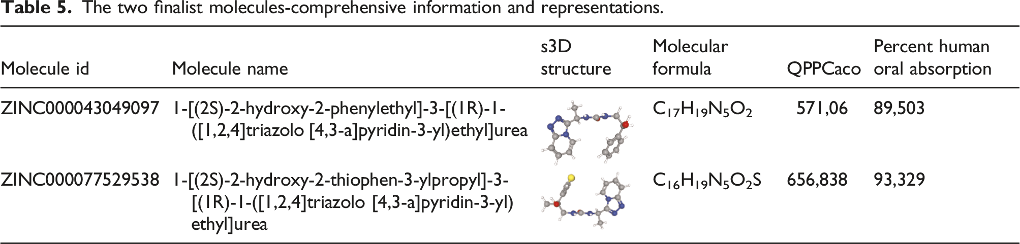 To further refine the selection, a subsequent screening step was performed based on the human oral absorption parameter for zidovudine, which was 65%.29–31 This value was in close agreement with literature estimates of approximately 64%. Nine molecules were excluded from consideration as their absorption values did not surpass 56%. Consequently, from the remaining 251 molecules, we identified 89 that displayed a Predicted Apparent Caco-2 Cell Permeability (QPPCaco) exceeding 500 nm/sec. This value is conventionally deemed suitable for assessing a drug’s capability to permeate the Caco-2 cell monolayer, an in vitro model of intestinal epithelium. Leveraging Schrödinger’s QikProp module, we harnessed a comprehensive array of molecular descriptors encompassing properties such as LogP, polar surface area (PSA), hydrogen bond donors and acceptors, molecular weight, and more. These descriptors are pivotal in predicting characteristics associated with absorption, distribution, metabolism, and excretion (ADME). Consequently, a final screening step focused on in silico toxicity evaluation yielded 78 molecules as candidates. Ultimately, after the culmination of rigorous evaluations, a subset of five molecules emerged as the most promising contenders that met all the established parameters. Refer to Figure 4(c) for a graphical representation of this selection process, while Table 3 provides an intricate display of the five potential candidate structures. This table encompasses pertinent details including nomenclature, 2D and 3D structures, chemical formulas, and other relevant data. General process of the virtual screening of the three therapeutic classes; NRTI (a), NNRTI (b) and PI (c). Potential candidate structures and relevant information for novel compounds for the NRTI class.
