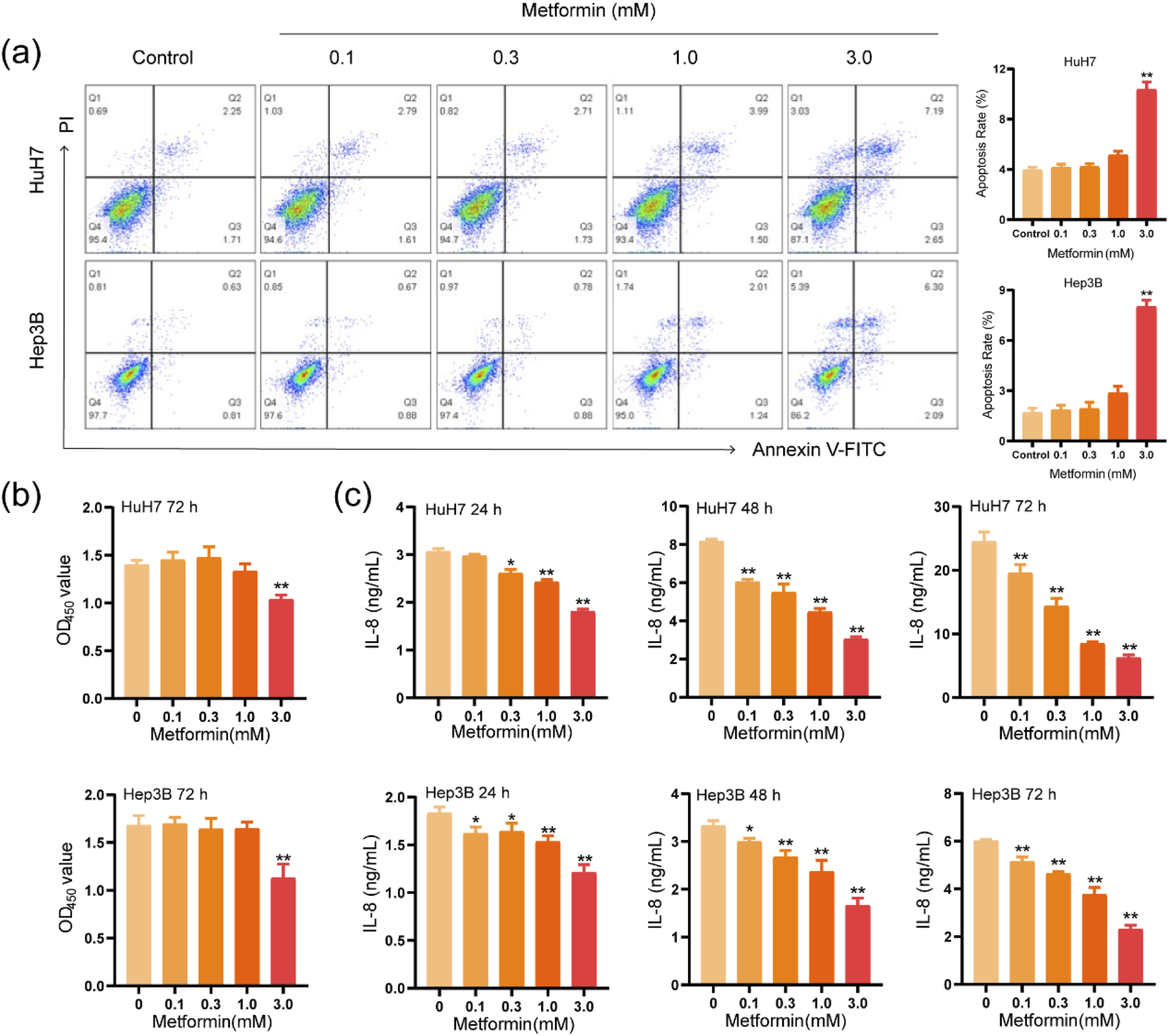 The IL-8 levels were measured in the plasma of 159 HCC patients (86 men, 73 women; average age 56 years) and in the culture supernatant of HCC cells (Hep3B and HuH7) using flow cytometry. In addition, the protein expression levels of IL-8 were also validated by the Human Protein Atlas (HPA) database. The prognostic value of IL-8 was evaluated using the Kaplan–Meier Plotter database. The association between IL-8 expression and immune checkpoints was estimated using the TIMER and The Cancer Genome Atlas (TCGA) databases. What’s more, bioinformatics analysis, western blotting, and transwell assays were conducted to illustrate the molecular mechanism of metformin (≤1 mM) on IL-8 in HCC.