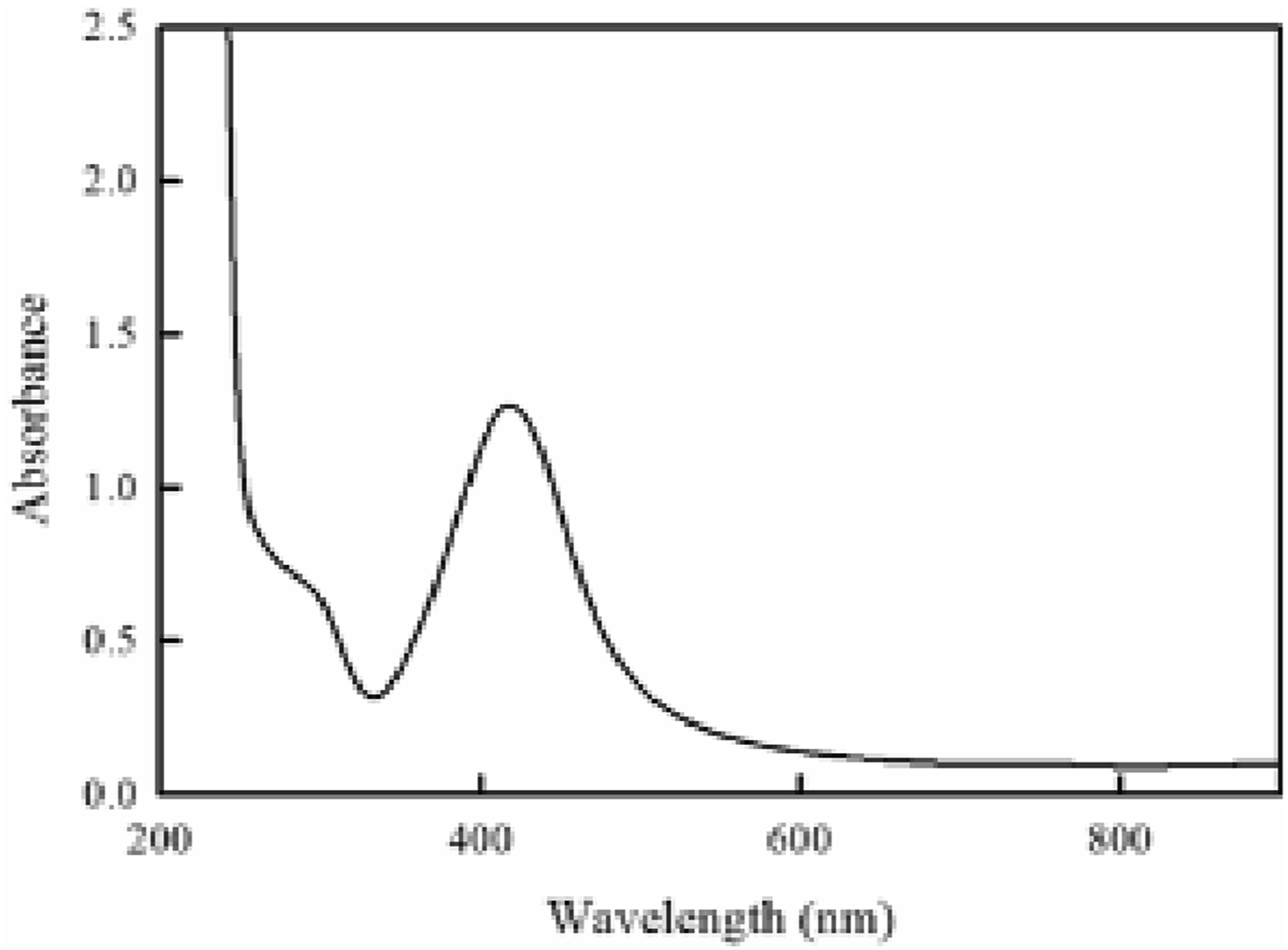 AgoNPs are readily detectable by UV-Vis spectroscopy because of their characteristic absorption maximum ranging between 380 and 430 nm. Figure 1 shows the UV/V absorption spectrum of the obtained colloidal AgoNPs. As clear, a characteristic absorption band of metallic AgoNPs surface plasmon resonance (SPR) absorption band appears at λmax (420 nm) which is compatible with the reported spherical AgNPs absorption band.