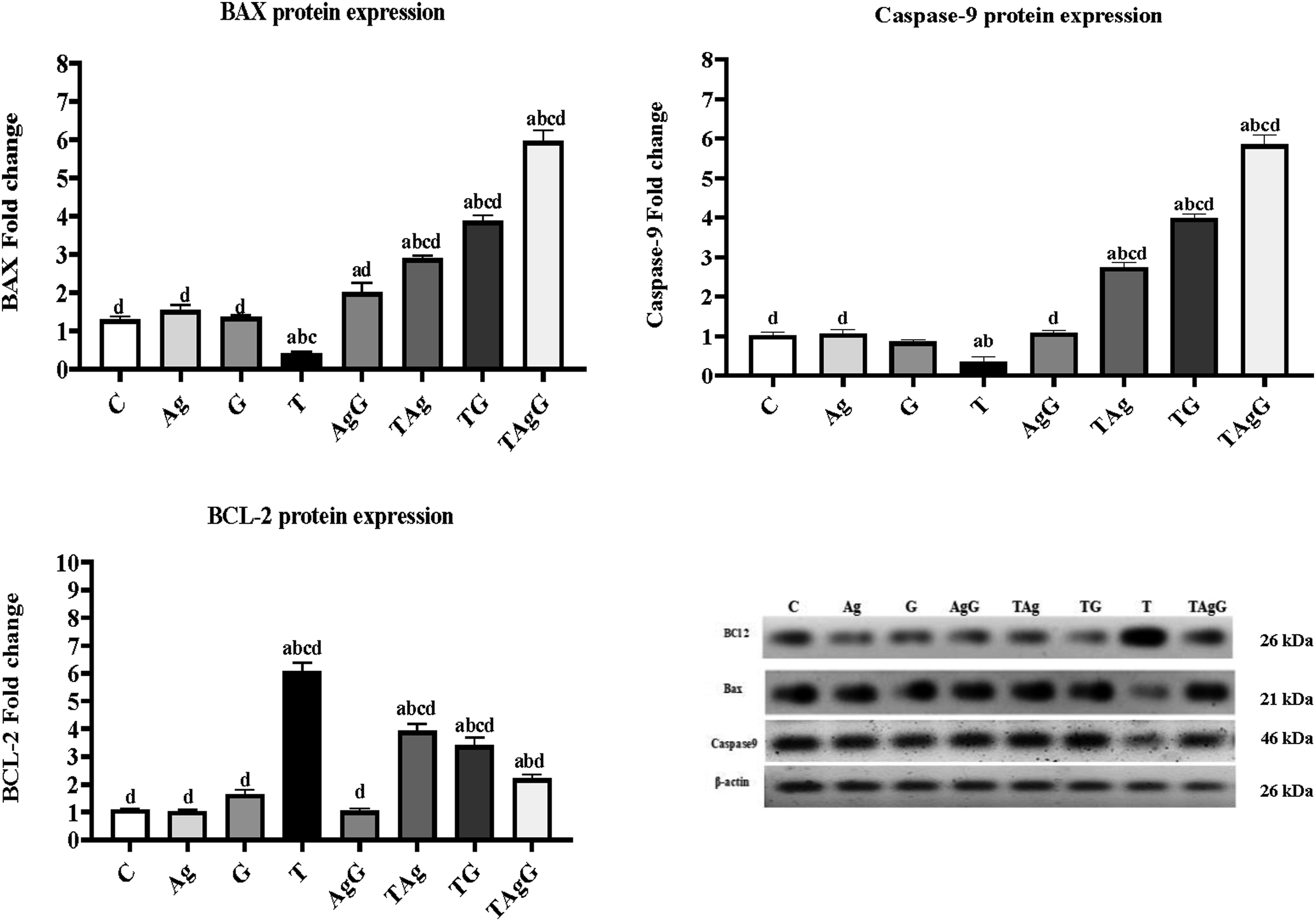 Besides, our investigation exhibits the mechanism understood that AgNPs mediated extrinsic and intrinsic apoptotic cell death. The proteins of apoptotic factors Bax, Caspase9, and the anti-apoptotic Bcl2 were isolated, and their expression levels were determined, as illustrated in Figure 10. The displayed results revealed that Bcl-2 expression was suppressed and Bax expression was up-regulated in rats treated with AgNPs compared to the control group. It has been proven that the boosted expression of Bax represents the main effector of the intrinsic pathway responsible for the induction of mitochondrial modifications that leads to cyt c and caspase −9 induction. 69 Kanipandian et al. 70 proved that the decreased Bcl2 level indicates that AgNPs effectively interfere with the intrinsic apoptotic activity by preventing the anti-apoptotic gene expression. Remarkably, it was demonstrated that the up-regulation of caspase 9 provokes caspase −3 levels in AgNPs treated cells. 70 Ahmadian et al. 71 demonstrated that AgNPs induce Bax gene expression and decrease Bcl2 expression. Rakowski et al., 72 reported that depending on the size surface modification, and shape of AgNPs can induce cytotoxicity, 73 mitochondrial dysfunction, and oxidative stress also enhance apoptosis. Moreover, in this study, GEM enhanced apoptosis by up-regulation of Bax and caspase9 and downregulation of Bcl2 protein expression; this data is compatible with Yuan et al. 7 documented that GEM single treatment can induce DNA fragmentation, also Teng et al. 71 documented that GEM not only inhibits cell proliferation and angiogenesis in tumor cells but also induces apoptosis. Zhu et al. 74 verified that GEM induces apoptosis in pancreatic cell lines by inhibiting Bcl2. Moreover, many previous studies demonstrate that GEM induced apoptosis by improving Bax and decreasing Bcl2 expression in breast cancer cells 75 and gall bladder cancer cells. 76