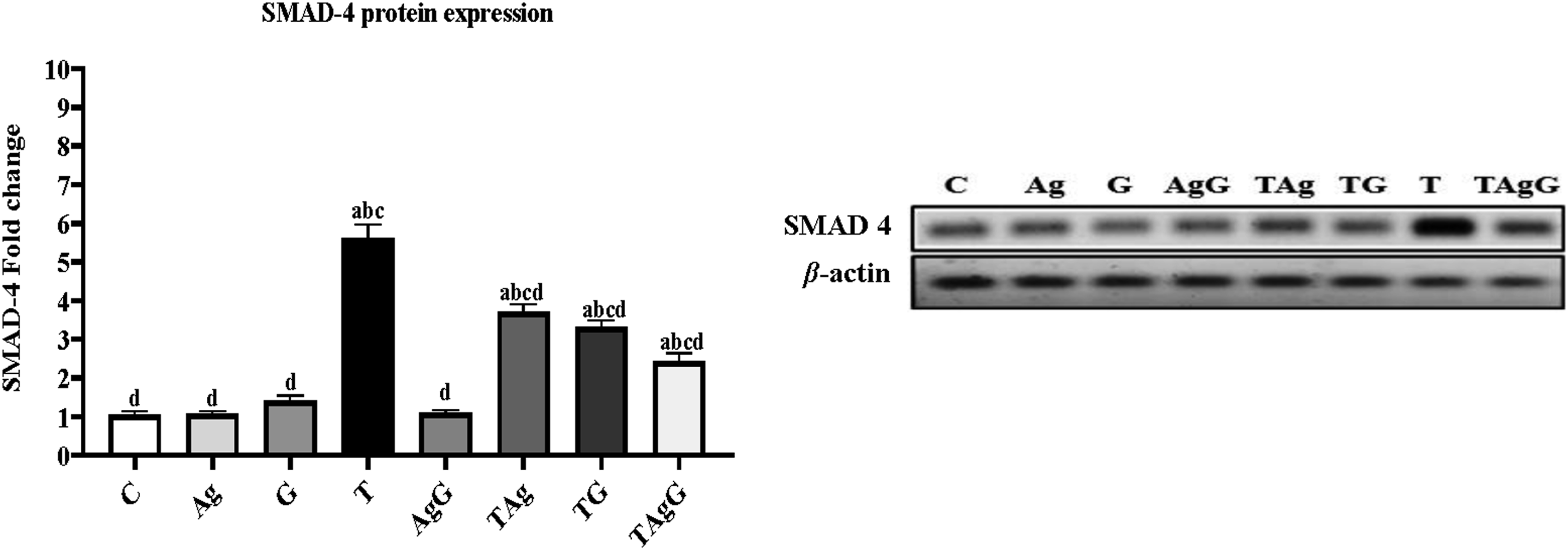 The protein expression of SMAD4 is presented in Figure 11. The expression of the T group was increased significantly ( The protein expression of SMAD 4 in all examined rats. Each value represents mean ± SE (