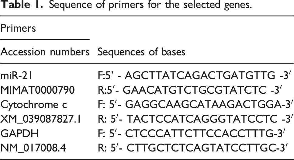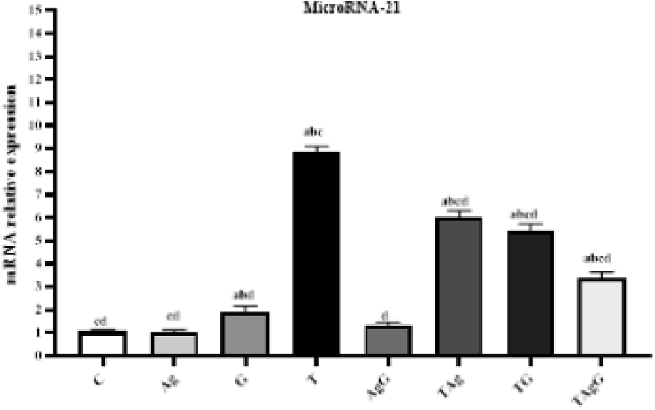 The gene expression of miR-21 in the T was significantly elevated ( The relative gene expression of miR-21 in different examined groups. Each value represents the mean ± SE (
