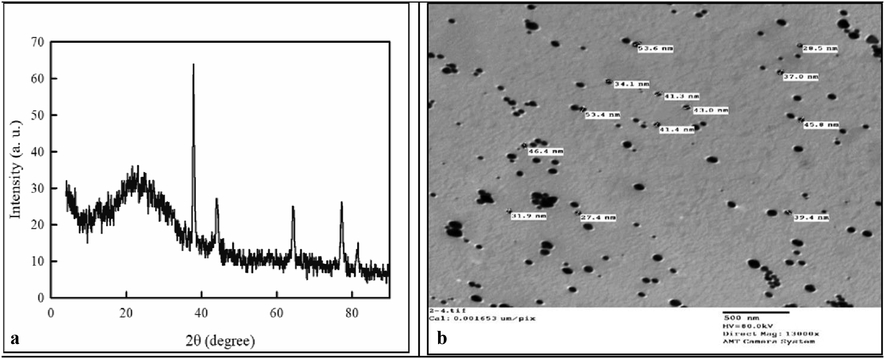 As clear from Figure 2(a), the XRD spectrum of the obtained AgoNPs shows well-defined characteristic diffraction peaks at 2θ values at 37.9°, 44.26°, 64.50°, and 77.29 assigned to diffractions planes (111), (200), (220), and (311), respectively confirming the formation of face centered cubic (fcc) structure of AgoNPs. The average crystallite size of the developed AgoNPs was calculated from XRD pattern using Scherrer’s equation