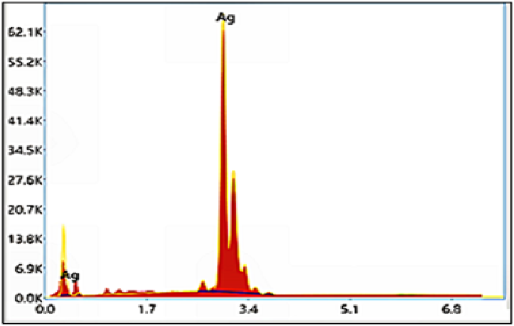 As clear from Figure 3, the appearance of a strong signal for Ag atoms in the range of 3 keV, which is a typical signal of the absorption of metallic and spherical silver nanocrystals due to surface plasmon resonance, confirmed the elemental composition of the prepared AgoNPs according to the EDX analysis profile and attested to the success of the AgoNPs preparation.