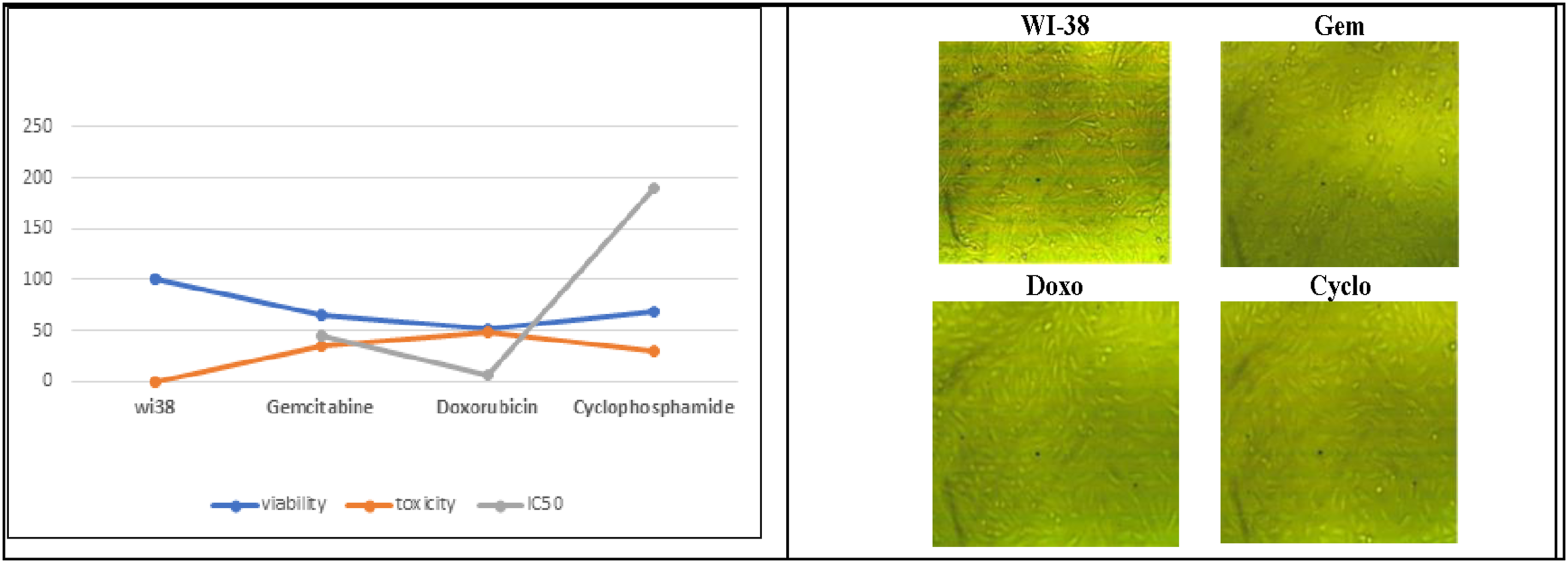 The mitochondrial activity of Wi38 and HepG2 cell lines was evaluated through an in vitro MTT assay. The control group consisted of Wi38 and HepG2 cells in RPMI media and was considered to have 100% viability and 0% toxicity. Drug concentrations ranging from 7.8 to 1000 µg/ml was used. The cytotoxicity of all drugs was estimated first on the normal cell line Figure 4. The results showed that doxorubicin exhibited the highest cytotoxic effect on Wi38 cells (48.7%), followed by cyclophosphamide (30.6%), while gemcitabine recorded a cytotoxic effect of 34.65%. More interestingly, cyclophosphamide has a lesser cytotoxic effect on the HepG2 cells Oppositely, doxorubicin is the most cytotoxic drug among them but it is also the most cytotoxic drug to the normal cells. IC50 was assessed for the three drugs (Gemcitabine 44.5, Doxorubicin 6.45, and Cyclophosphamide 190.56 µg/ml) (Figure 5). Interestingly, cyclophosphamide had a lesser cytotoxic effect on the HepG2 cells. In contrast, doxorubicin was the most cytotoxic drug among them, but it also had the most cytotoxic effect on normal cells. The IC50 values for the three drugs were assessed as follows: Gemcitabine 44.5 µg/ml, Doxorubicin 6.45 µg/ml, and Cyclophosphamide 190.56 µg/ml (Figure 5). MTT cytotoxicity assay (% of cell viability, % of cell toxicity and IC50) of the chemotherapeutic drugs on Wi38 cell (the value displayed as means ± SE ( MTT cytotoxicity assay (% of cell viability) and IC50 of different chemotherapeutic drugs on HepG2 cells (the value displayed as means ± SE (