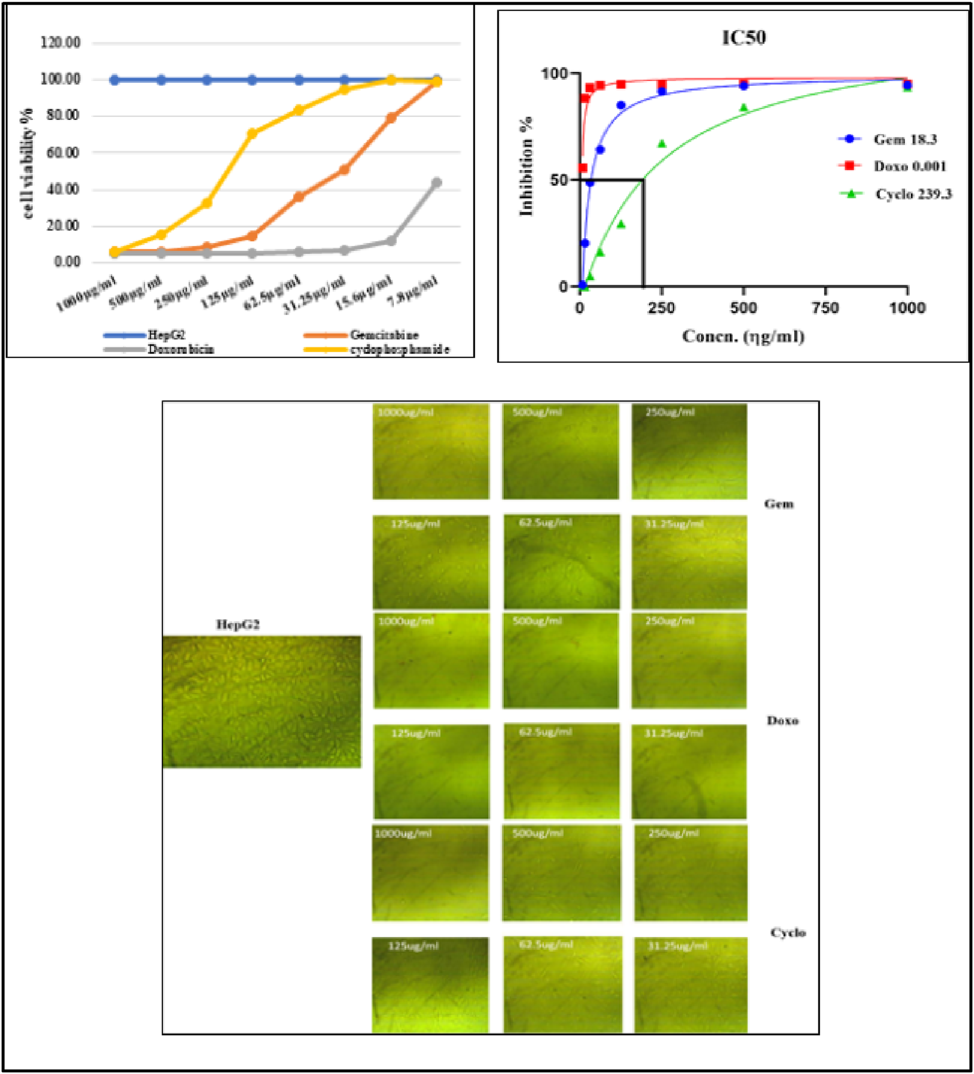 and MTT reagent [3-(4,5-dimethyl-thiazol-2-yl)-2,5-diphenyl-tetrazolium bromide] was used. Initially, 1 × 105 cells were seeded and incubated at 37°C, 10% CO2 for 24 h to develop a complete monolayer sheet. Next,100 μL of various concentrations of drugs, including Gemcitabine (GEM) Doxorubicin (Doxo), and Cyclophosphamide (Cyclo) (ranging from1000 - 7.81 μg/mL) were added to RPMI 1640 complete media in a 96-well -plate. The plate was incubated for 24 h at 37°C, 10% CO2. For control purposes, HepG2 and Wi38 cells in RPMI media were considered as control (100% viable). Then, 10 μL of freshly prepared MTT solution (0.5 mg/mL) was added to each well. The plate was incubated in the dark for 4 h to develop color. Finally, 200 μL of DMSO/well was added to dissolve MTT formazan, and the absorbance was measured at 570 nm. The percentage of cell cytotoxicity was calculated using the following equation: