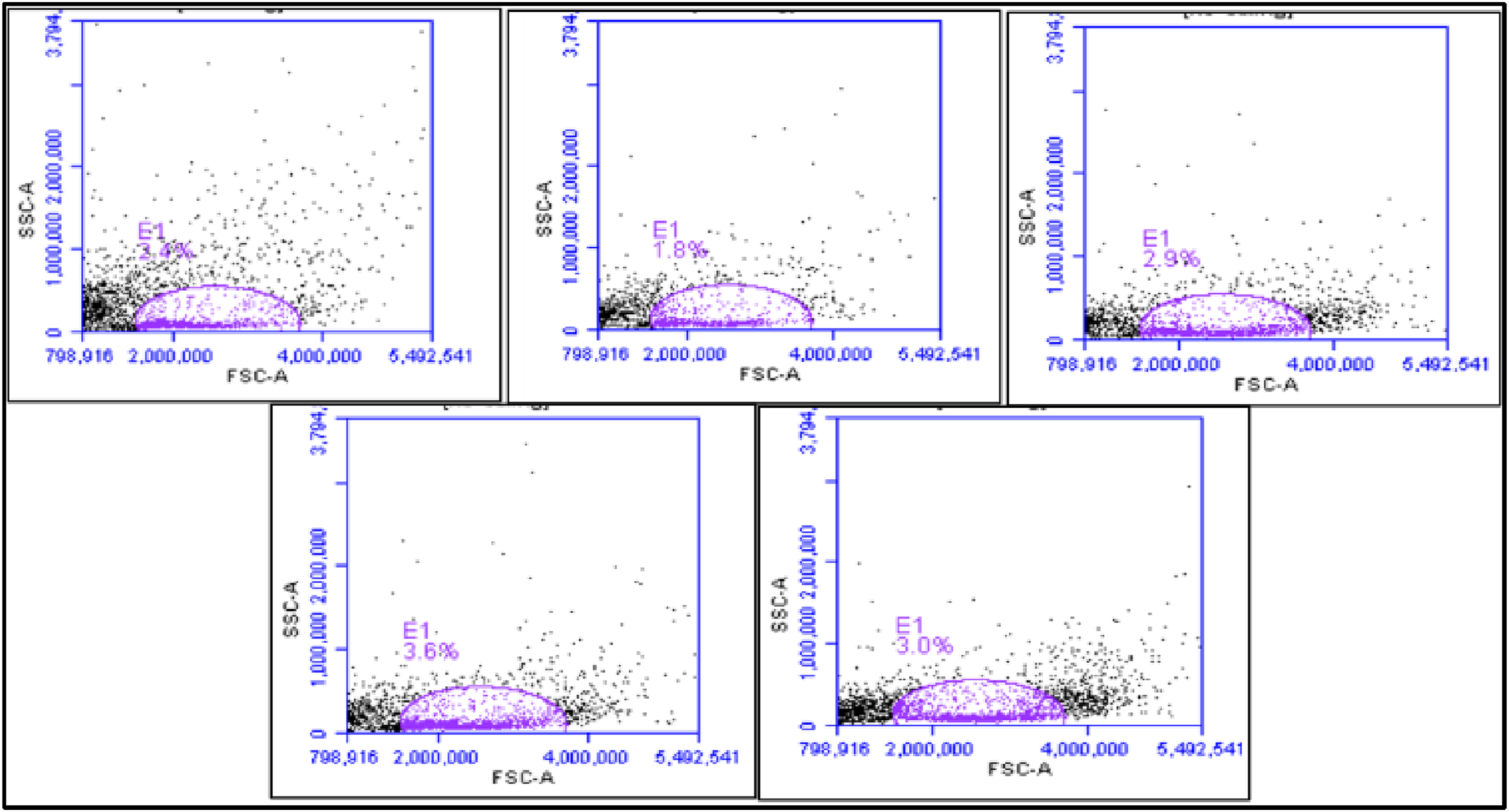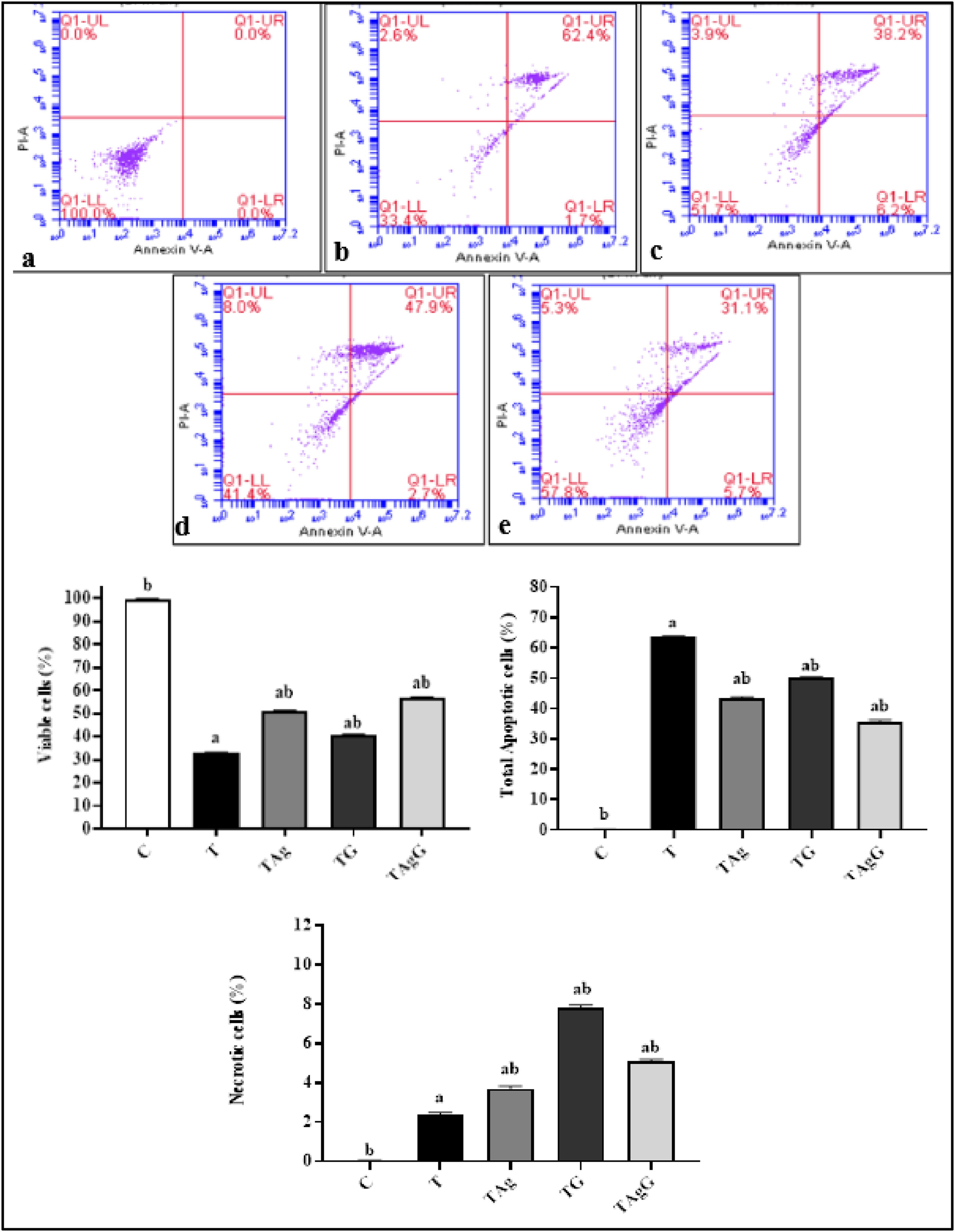 Apoptotic Annexin V/PI lymphocyte distribution using flow cytometry analysis was shown in dot plots and histograms (Figures 7 and 8). Annexin V/PI staining defined the apoptotic and non-apoptotic population of cells. In the present work, the total apoptotic activity (V+/PI−) and (V+/PI+) significantly increased in T group (63.6 ± 0.32) comparing to the healthy control group (0.15 ± 0.08). However, our results demonstrated that Gem can reduce the total apoptosis of lymphocyte (50.07± compared to T group. In addition, the AgNPs administration showed a potent decrease in apoptosis (43.5 ± 0.46) compared to T group. Remarkably, the combination of AgNPs and Gem established a synergistic effect counter HCC development in TAgG (35.68 ± 0.58) contrary to the T group. Flow cytometric profile of blood lymphocytes of all tested groups stained with Annexin V/FITC in Forward scatter (FSC) versus side scatter (SSC) plots after doublet exclusion. (a) Control (C); (b) HCC (T); (c) HCC-AgNPs treated group (TAg); (d) HCC-Gem treated group (TG); (e) HCC- AgNPs- Gem treated group (TAgG).