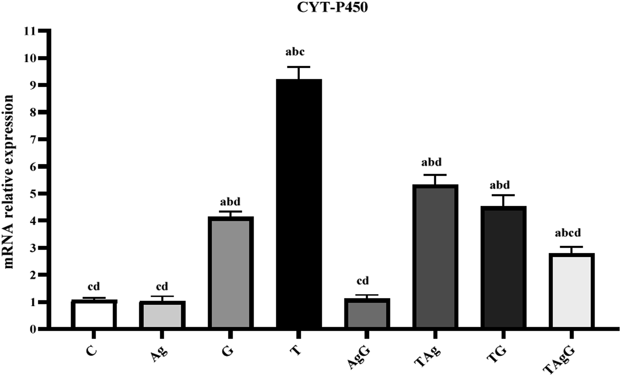 In the present work, the expression of liver CYT P450 mRNA of the control(C) group was 1.06 ± 0.09 folds. The developed HCC group (T) exhibited a significant increase in CYT P450 mRNA compared to the control group. Nevertheless, the results revealed significant improvement in the HCC group treated with AgNPs (TAg) (5.31 ± 0.38) or Gem (TG) (4.51 ± 0.43) compared to the T group (9.20 ± 0.47) ( The relative gene expression of CYT-P450 m-RNA in different examined groups. Each value represents the mean ± SE (