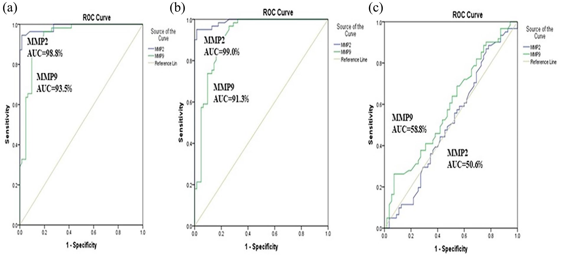 Receiver operating characteristic curves for prediction capacity of MMP-2 and MMP-9: (a) non-metastatic versus healthy controls, (b) metastatic versus healthy controls, (c) non-metastatic versus metastatic.