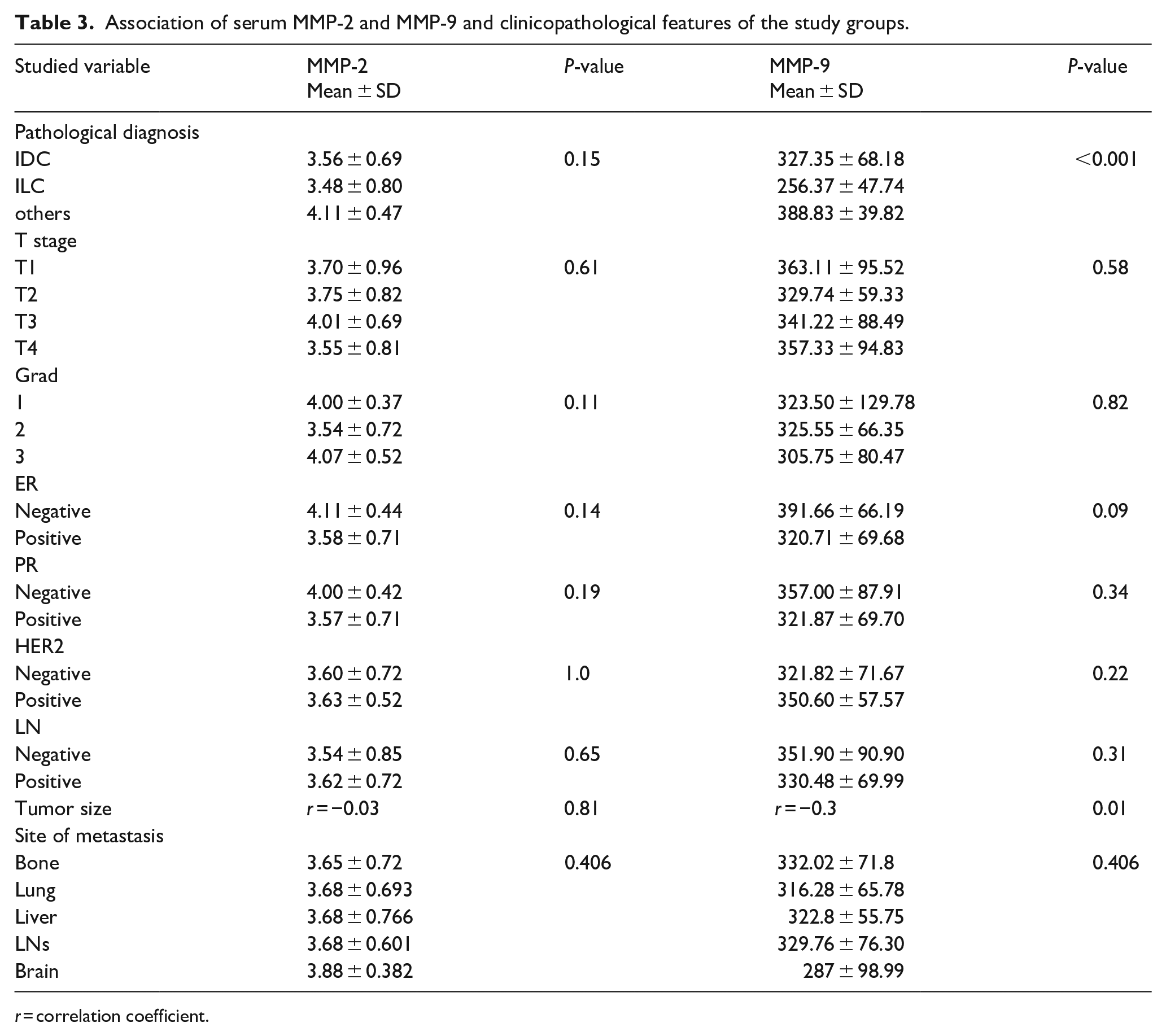 Analysis of MMP-2 and MMP-9 levels in relation to clinicopathological factors of breast cancer patients indicated a notable correlation between serum MMP-9 and both the pathological diagnosis of breast cancer (