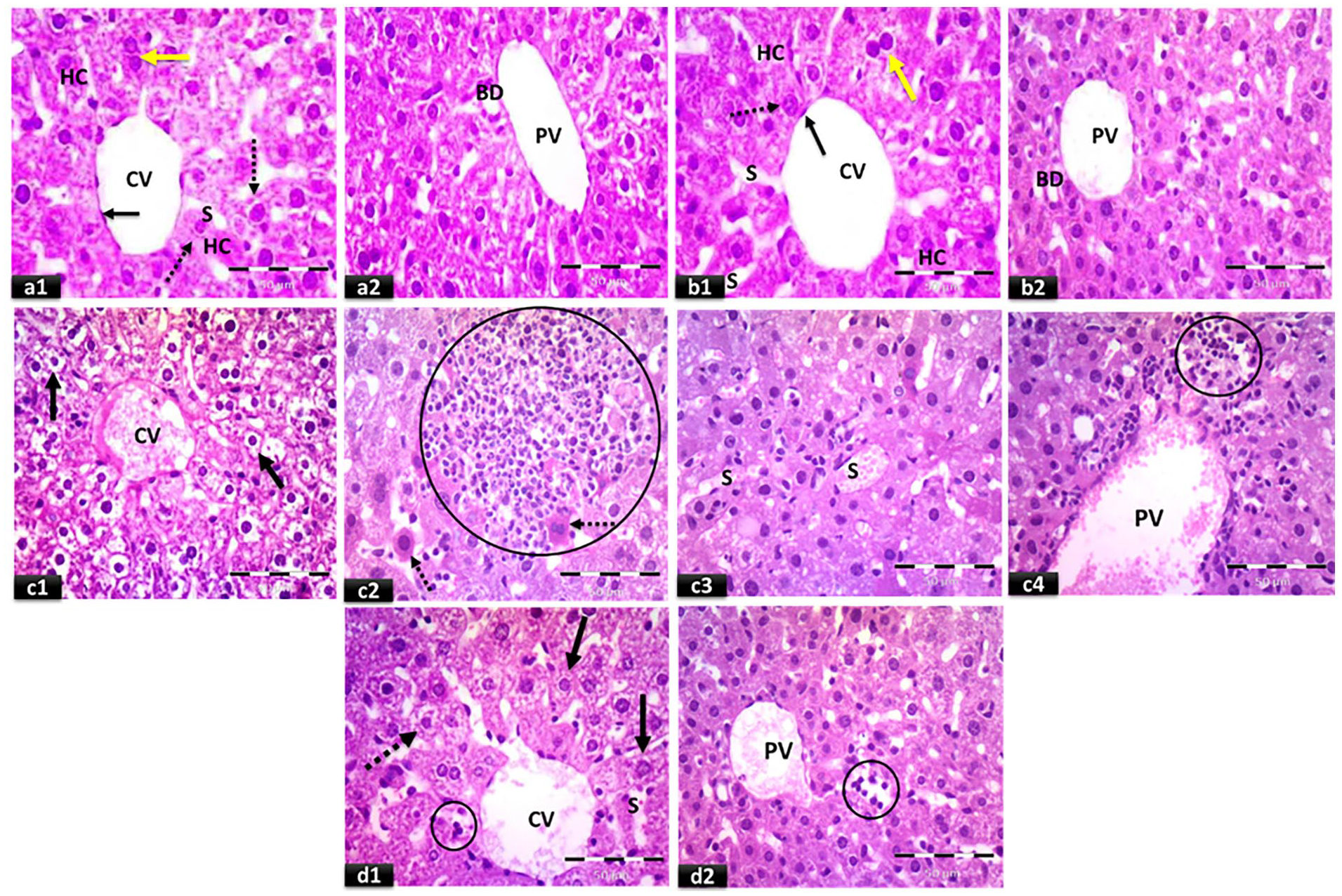 Representative photomicrographs of light microscopic examination of H&E-stained liver sections: (a) control group, (b) calcitriol group, (c) cisplatin group, and (d) calcitriol + cisplatin group (×400, scale bar = 50 μm). Normal central vein (CV) and strands of hepatocytes (HC) can be seen in (a1 & b1). The central vein is outlined by thin endothelium with flattened nuclei (black arrows). Hepatocytes with acidophilic cytoplasm and rounded vesicular nuclei (dotted arrows), binucleated cells (yellow arrows), and narrow blood sinusoids (S) are observed. (a2 & b2) showing the portal tract containing the portal vein (PV) and bile duct (BD) lined with single cuboidal cells. (c1–c4) showing congested central vein (CV), vacuolated hepatocytes (black arrows), cells with strongly acidophilic cytoplasm and darkly stained nuclei (dotted arrows), inflammatory cells’ infiltration (circles), dilated congested blood sinusoids (S), and dilated congested portal vein (PV). (d1 & d2) showing apparently normal central vein (CV) with minimal congestion, apparently normal hepatocytes with acidophilic cytoplasm and vesicular nuclei (black arrows), cells with vacuolated cytoplasm (dotted arrow), slightly dilated blood sinusoids (S), apparently minimal inflammatory cells’ infiltration (circles), and slightly congested portal vein (PV).