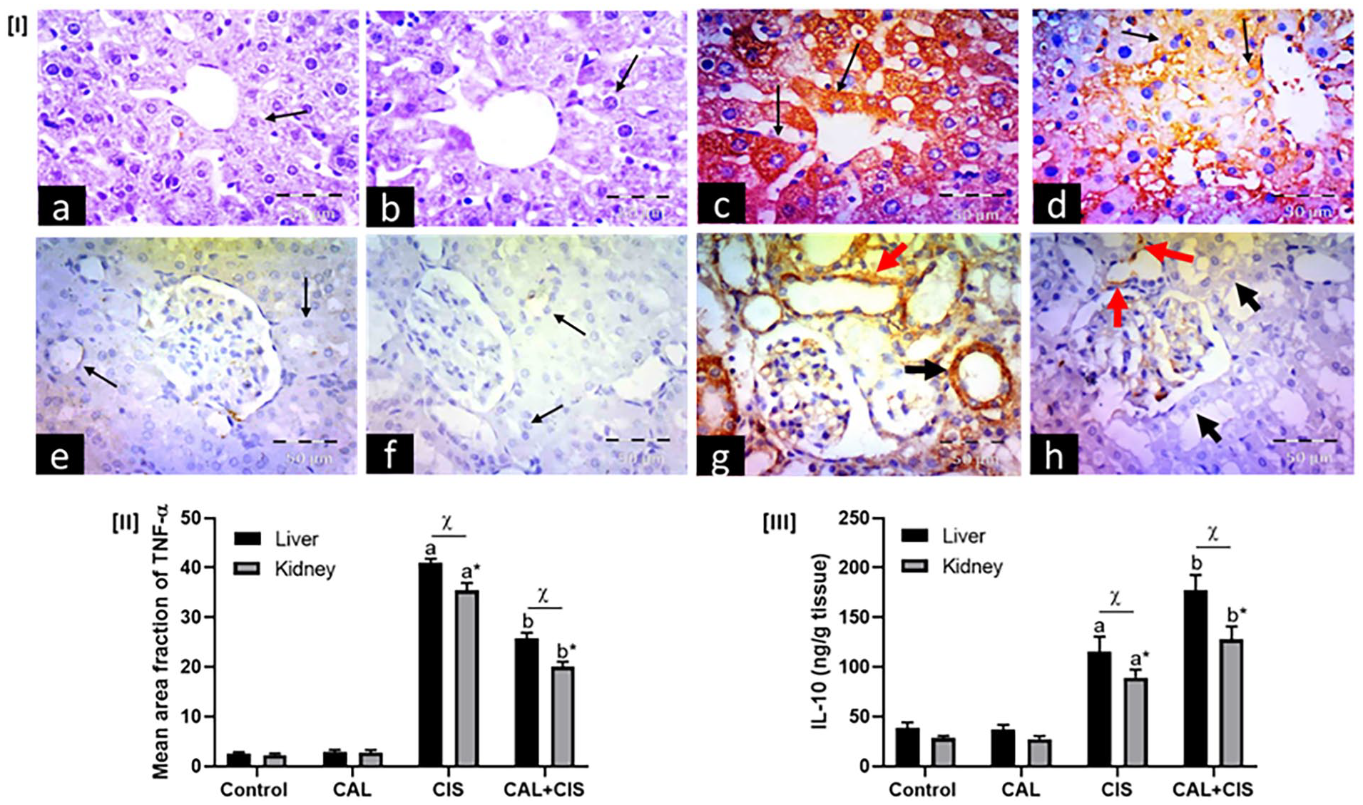 Panel I: Representative immunohistochemical photomicrographs of liver (a–d) and renal cortex (e–h) stained for tumor necrosis factor-alpha (TNF-α) (×400, scale bar = 50 μm), where (a, e) control groups, (b, f) calcitriol (CAL) groups, (c, g) cisplatin (CIS) groups, and (d, h) CAL + CIS groups. (a, b) show negative expression in hepatocytes (arrows). (c) shows many hepatocytes with strong positive cytoplasmic expression (arrows). (d) shows scattered cells with faint positive cytoplasmic expression (arrows). On the other hand, (e, f) show negative expression in the tubular cells (arrows). (g) shows strong cytoplasmic expression in proximal convoluted tubules (black arrow) and distal convoluted tubules (red arrow). (h) shows scattered tubular cells with minimal positive cytoplasmic expression (red arrows), while many cells have negative expression (black arrows). Panel II: A semi-quantitative analysis of TNF-α mean area fraction. Panel III Effect of CAL on hepatic and renal IL-10 levels in CIS-treated rats. Data are represented as mean ± SEM (