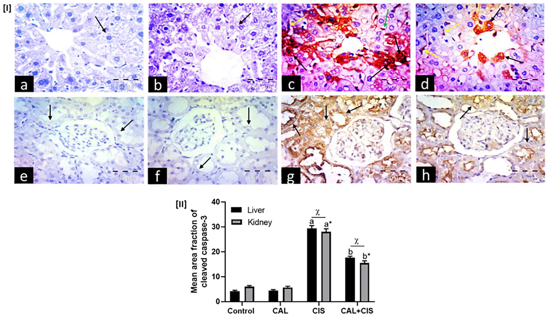 Panel I: Representative immunohistochemical photomicrographs of liver (a–d) and renal cortex (e–h) stained for cleaved caspase-3 (×400, scale bar = 50 μm), where (a, e) control groups, (b, f) calcitriol (CAL) groups, (c, g) cisplatin (CIS) groups, and (d, h) CAL + CIS groups. (a, b) show negative expression in hepatocytes (arrows), while (e, f) show negative expression in renal tubular cells (arrows). (c) shows abundant hepatocytes with positive nuclear and cytoplasmic expression (black arrows) and positive expression in Kupffer cells (yellow arrow) and endothelial cells (green arrow), while (g) reveals strong cytoplasmic expression in tubular cells (arrows). (d) shows scattered cells with positive cytoplasmic expression (black arrows) and positive expression in Kupffer cells (yellow arrows), while (h) reveals faint cytoplasmic expression in tubular cells, mostly in the apex (arrows). Panel II: A semi-quantitative analysis of caspase-3 mean area fraction. Data are represented as mean ± SEM (