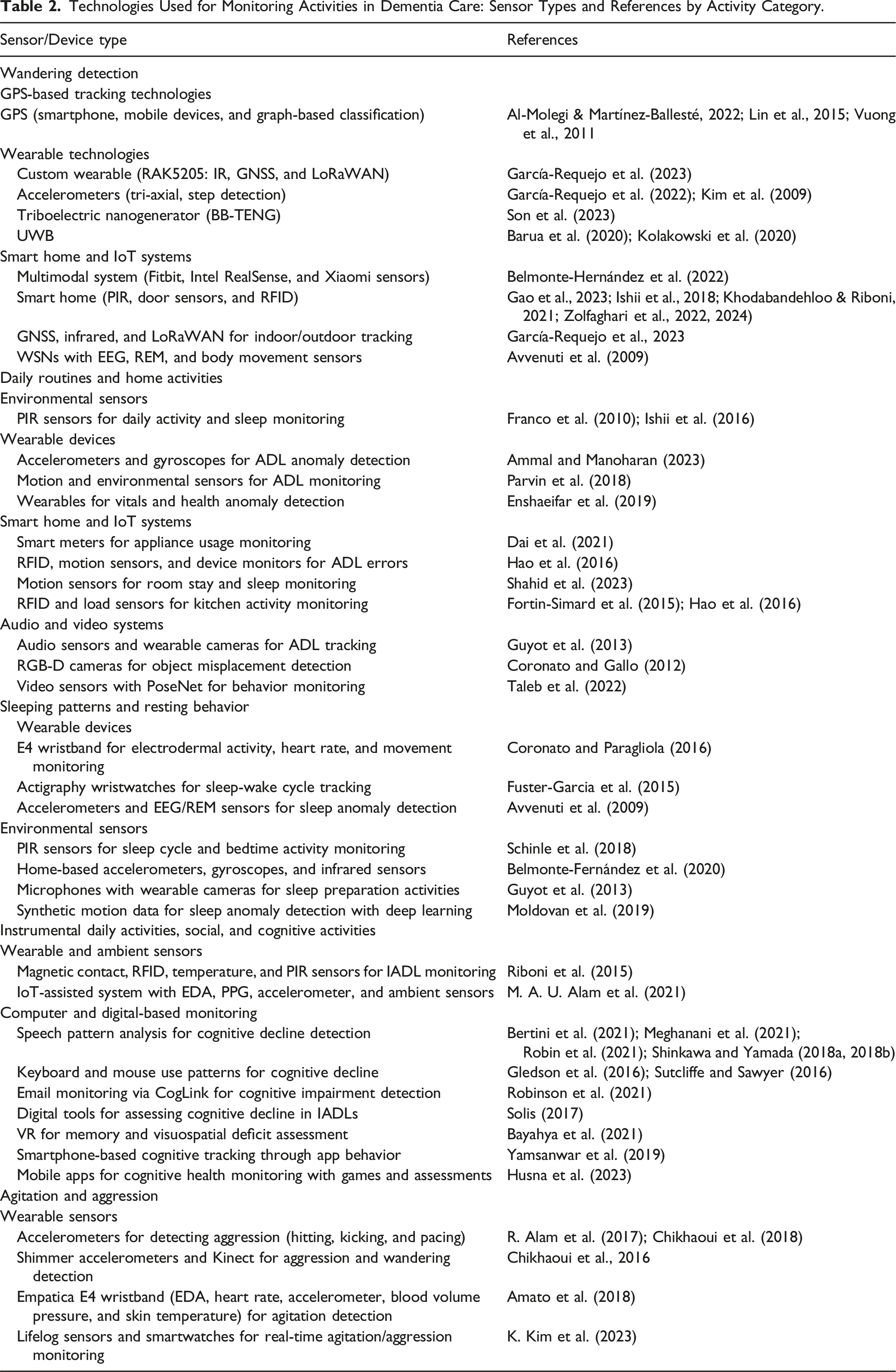 Technologies Used for Monitoring Activities in Dementia Care: Sensor Types and References by Activity Category.