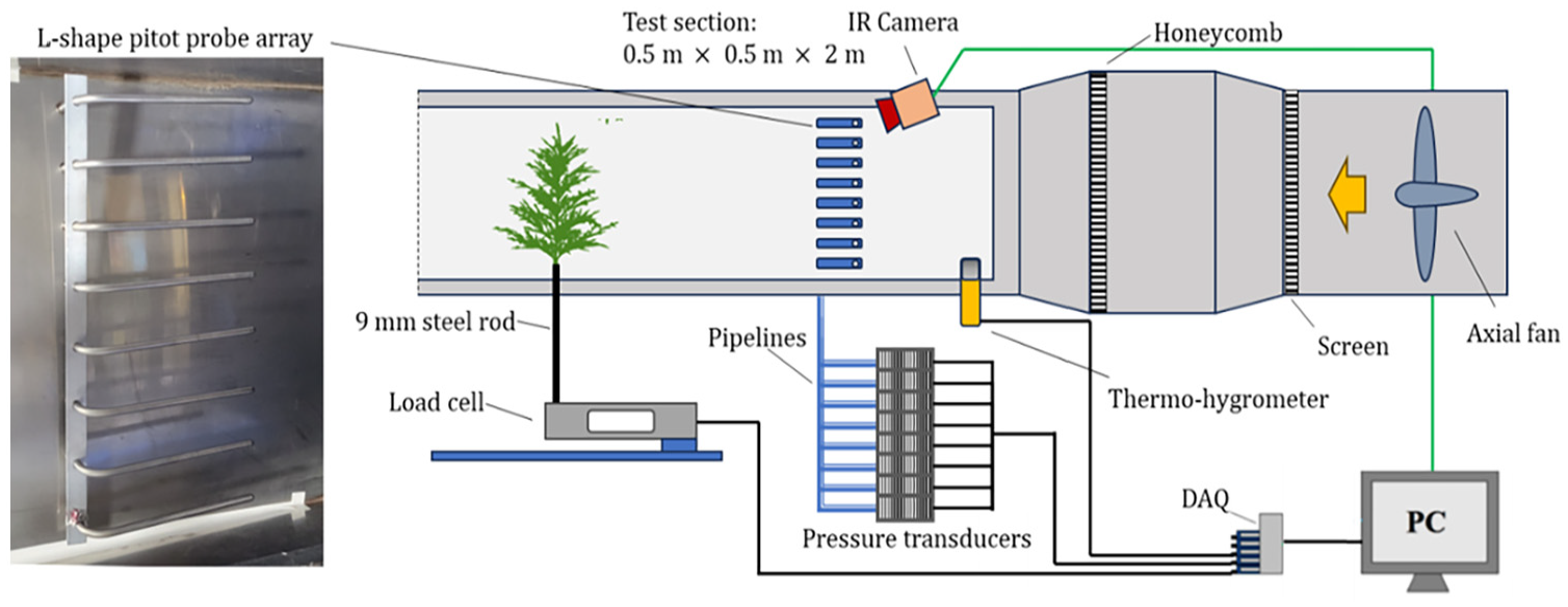 Evaporation experiments were conducted in a stainless steel wind tunnel consisting of a settling chamber with a honeycomb airflow straightener, a contraction section, and a test section with dimensions of 0.5 × 0.5 × 2 m3 (width × height × length). Figure 1 shows a schematic of the experimental setup. The airflow was provided by a 0.91-m diameter axial fan controlled by a variable frequency drive. The mass loss of the branch sample was measured at the sampling rate of 1 Hz using a single-point load cell (ATO.co., Model: ATO-LC-SP01) placed underneath the wind tunnel. (Certain commercial entities, equipment, or materials may be identified in this document to describe an experimental procedure or concept adequately. Such identification is not intended to imply recommendation or endorsement by the National Institute of Standards and Technology, nor is it intended to imply that the entities, materials, or equipment are necessarily the best available for the purpose.) A 9-mm diameter steel rod was mounted on the load cell below the test section and passed up through a 3-cm diameter hole on the floor of the wind tunnel test section. The base of the branch sample was mounted to the rod with a clamp.