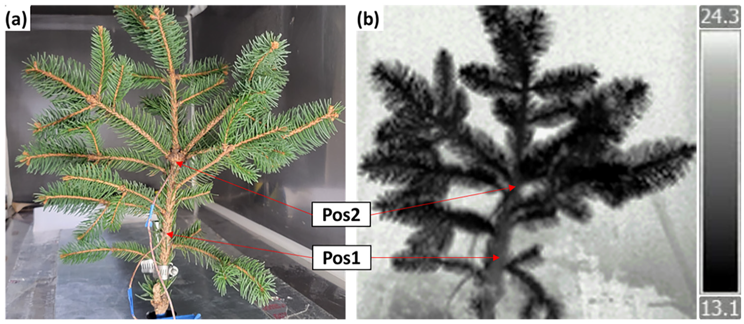 Norway Spruce Specimen 2 in the wind tunnel with (two) thermocouples embedded in its main stem; (a) photograph and (b) thermal image immediately after the fan was on. The dark color indicates a sub-ambient temperature, with pixel temperature associated with the color bar on the right.