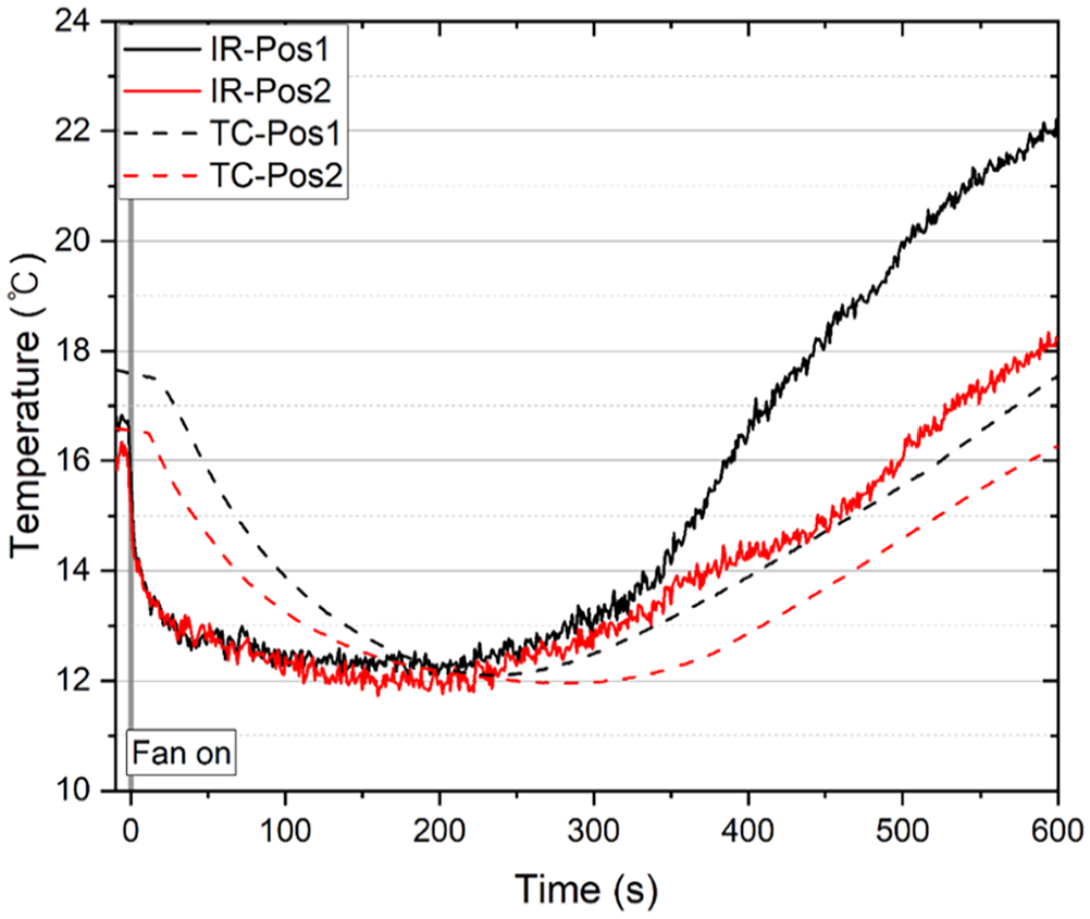 Temperature measured using the IR camera and thermocouples at two positions (presented in Figure 4) on the main stem of Norway Spruce Specimen 2 (test 2A) as a function of time after the wind tunnel fan was started. The mean free-stream speed,