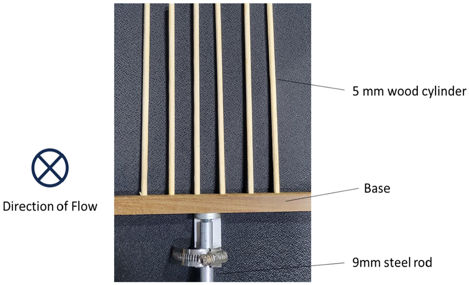 Photograph of the wood array consisting of six, 5-mm diameter, wood cylinders. The direction of wind tunnel airflow was into the page as indicated by the diagram on the left.