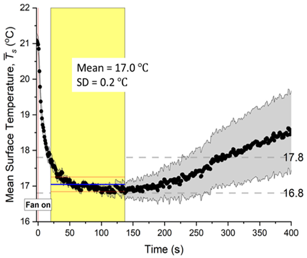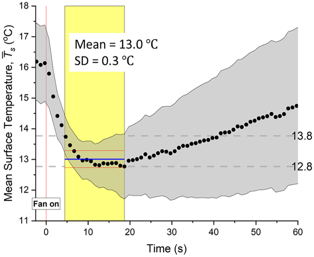 The mean surface temperature (black line) averaged along the centerlines of each of the 5-mm diameter wood cylinders as a function of time after the fan was turned on. The free steam speed (