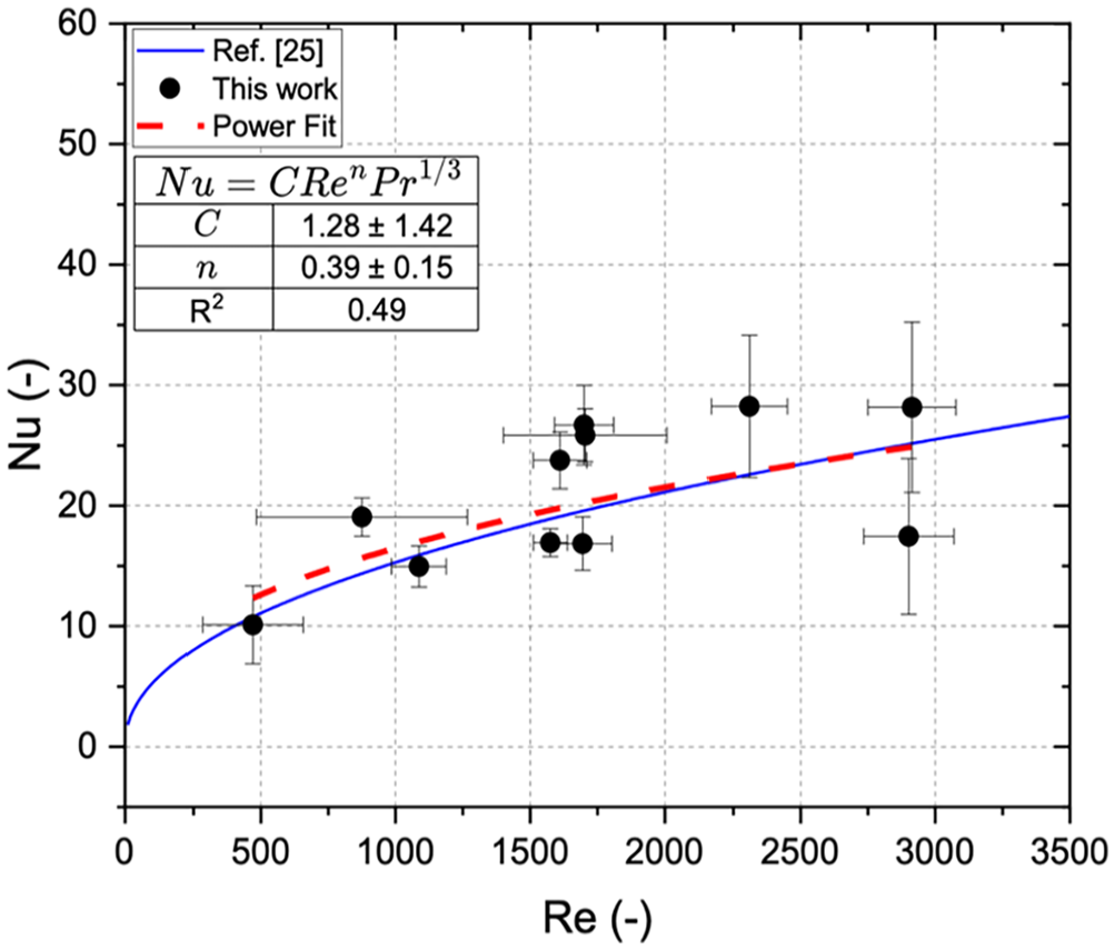The Nusselt number as a function of the Reynolds number for the wood cylinder array in the wind tunnel. The dashed red line shows the power–law fit for the Reynolds number and the solid blue line shows the literature correlation. 25 Error bars represent the expanded combined uncertainty denoting a 95% confidence interval.