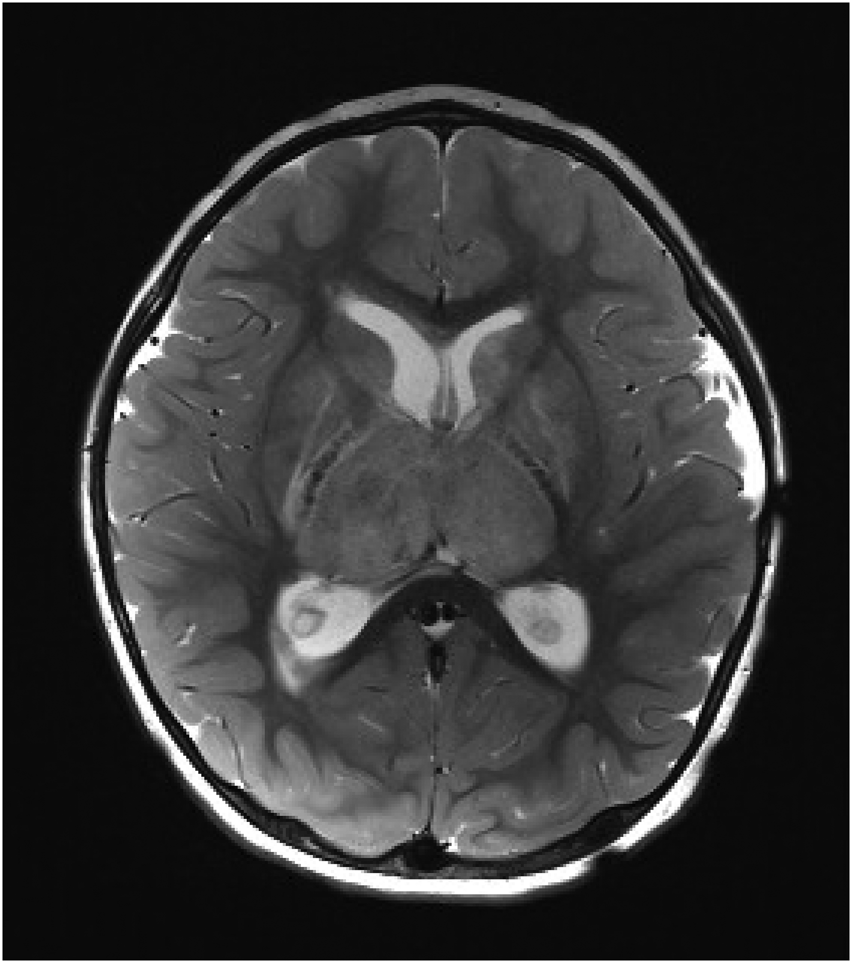 Axial T2-weighted magnetic resonance imaging (MRI) scan from a 24-month-old female with iron deficiency anemia and cerebral venous sinus thrombosis showing edema due to venous infarcts of the right greater than left thalami and obstructive hydrocephalus at the level of the third ventricle secondary to thalamic swelling.