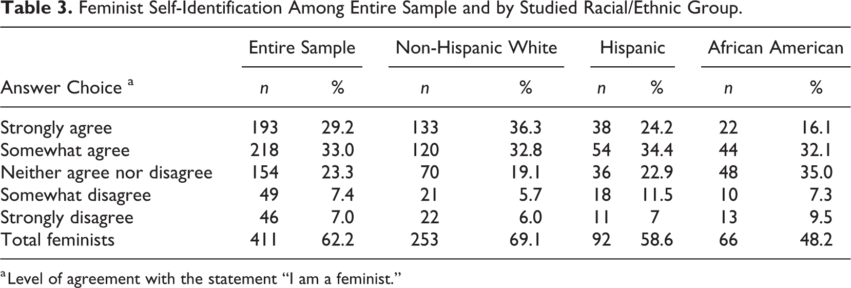 In the present study, when asked to rate the statement, “I am a feminist,” 29% of MSW students indicated that they strongly agreed, 33% indicated that they somewhat agreed, 23% neither agreed nor disagreed, 7% somewhat disagreed, and 7% strongly disagreed. In sum, 62% of students endorsed a feminist identity to some extent. Among non-Hispanic white students, 69% were feminist; among Hispanic students, 59% were feminist; and among African American students, 48% were feminist. (See Table 3 for feminist identity in the entire sample and by race/ethnicity.)