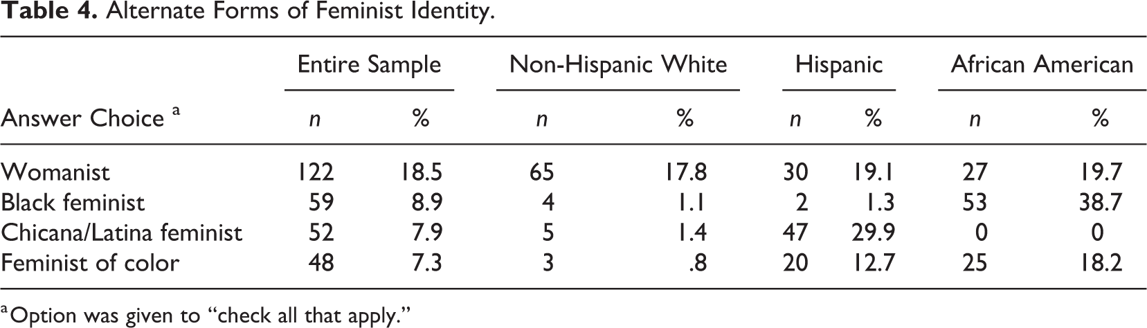 In this study, 17% of non-Hispanic white, 19.1% of Hispanic, and 20% of African American respondents endorsed being a “womanist.” Among African American students, 39% reported being “black feminists” (while 1% of non-Hispanic whites and Hispanic respondents identified as black feminists). Almost a third of Hispanic students (30%) identified being Chicana or Latina feminists. (One percent of non-Hispanic white students and zero African American students called themselves Chicana or Latina feminists.) A much smaller portion of Hispanic students identified as feminists of color (13%), and a smaller portion of African American students identified as feminists of color (18%). Less than 1% of non-Hispanic white students called themselves feminists of color. (Please see Table 4 for an overview of alternate feminist identities.)