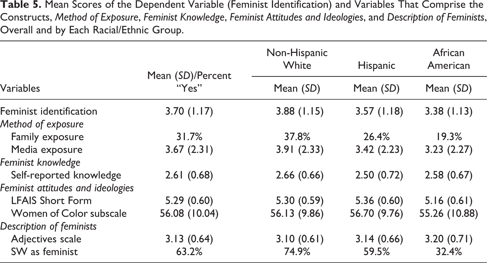 Mean Scores of the Dependent Variable (Feminist Identification) and Variables That Comprise the Constructs,