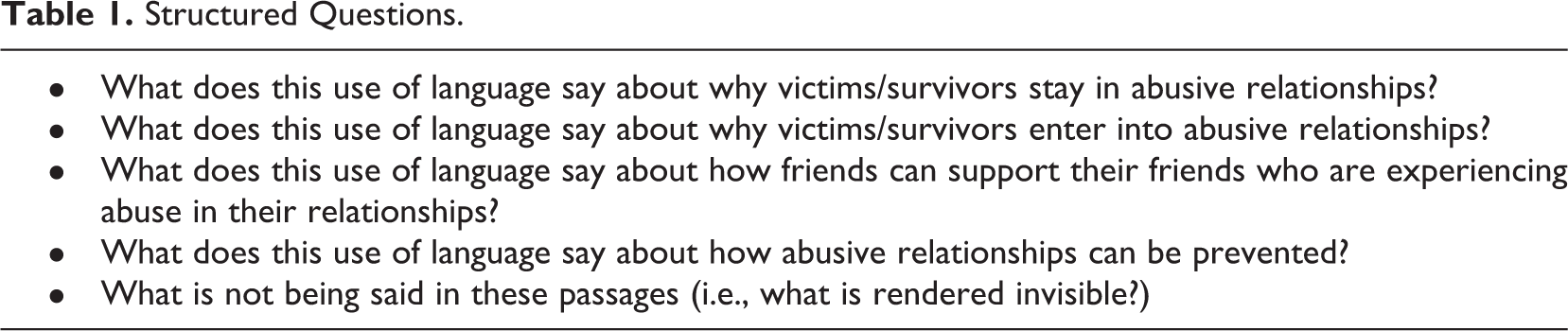 Popular culture has been a primary means of transmitting postfeminist discourse, particularly as it relates to dating and domestic abuse. Analysis of the representation of dating abuse in young adult literature shows that postfeminist discourses of choice and personal responsibility are used to describe TDV survivors’ entry into abusive relationships (Storer, 2017). Additionally, scholars have described how song lyrics and music videos have portrayed dating abuse survivors as being culpable in their abuse, displayed “victim-blaming” behaviors, and minimized the seriousness of dating abuse (Enck & McDaniel, 2012; Thaller & Messing, 2014). Patterson and Sears’ (2011) analysis of celebrity culture, particularly through media blogs and websites, uncovered a “bitch” rhetoric consistent with postfeminist notions of personal responsibility that focuses on what survivors do to provoke their partner’s abuse and reduces perpetrators’ accountability for their use of coercive tactics. These representations of dating domestic abuse, which reinforce notions of survivor culpability and individual responsibility (while omitting references to structural drivers of abuse), exemplify many of the elements of a postfeminist discourse. Because “victim-blaming” and other disempowering responses to abuse can be associated with poorer outcomes for survivors (Flicher et al., 2012), it is critical that we continue to assess the dating abuse–related discourses that predominate among young people.