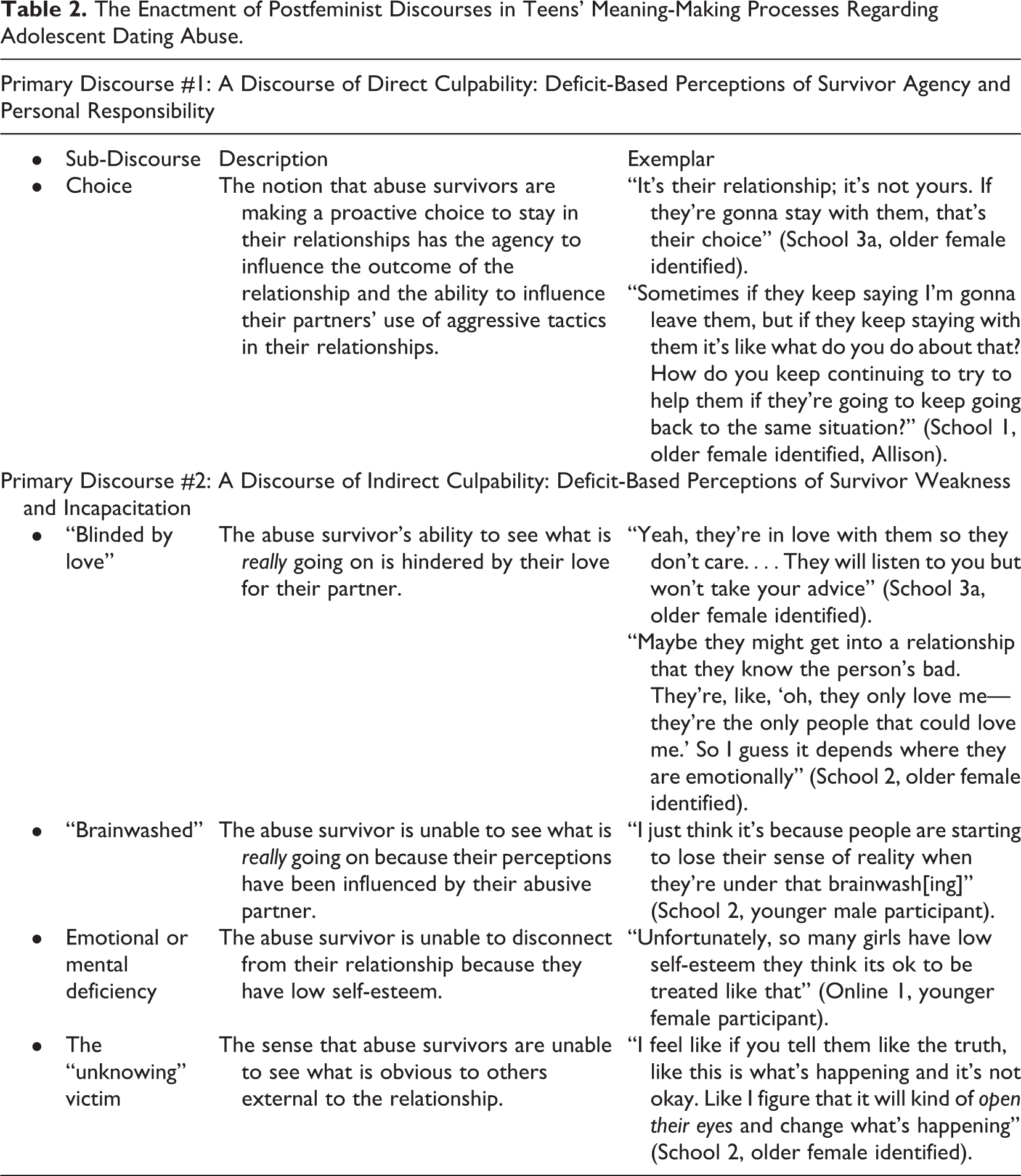 In the following section, we will describe the various ways that postfeminist discourse is enacted in teens’ use of language about dating abuse generally and about teen dating abuse survivors specifically. Across this sample of focus groups, dating abuse survivors were represented as being either directly or indirectly culpable for entering into and/or staying with an abusive partner. Furthermore, survivors were positioned as having the agency to discontinue an abusive relationship. The discourse of being indirectly culpable was illustrated through framing survivors as being “brainwashed,” “blinded by love,” or having personal deficits that hindered their interpretations of the events in their relationships. Absent from these discursive formations was any notion of resilience or survivor empowerment or any acknowledgment of the challenges of leaving abusive relationships. These discursive formations have been summarized in Table 2.